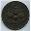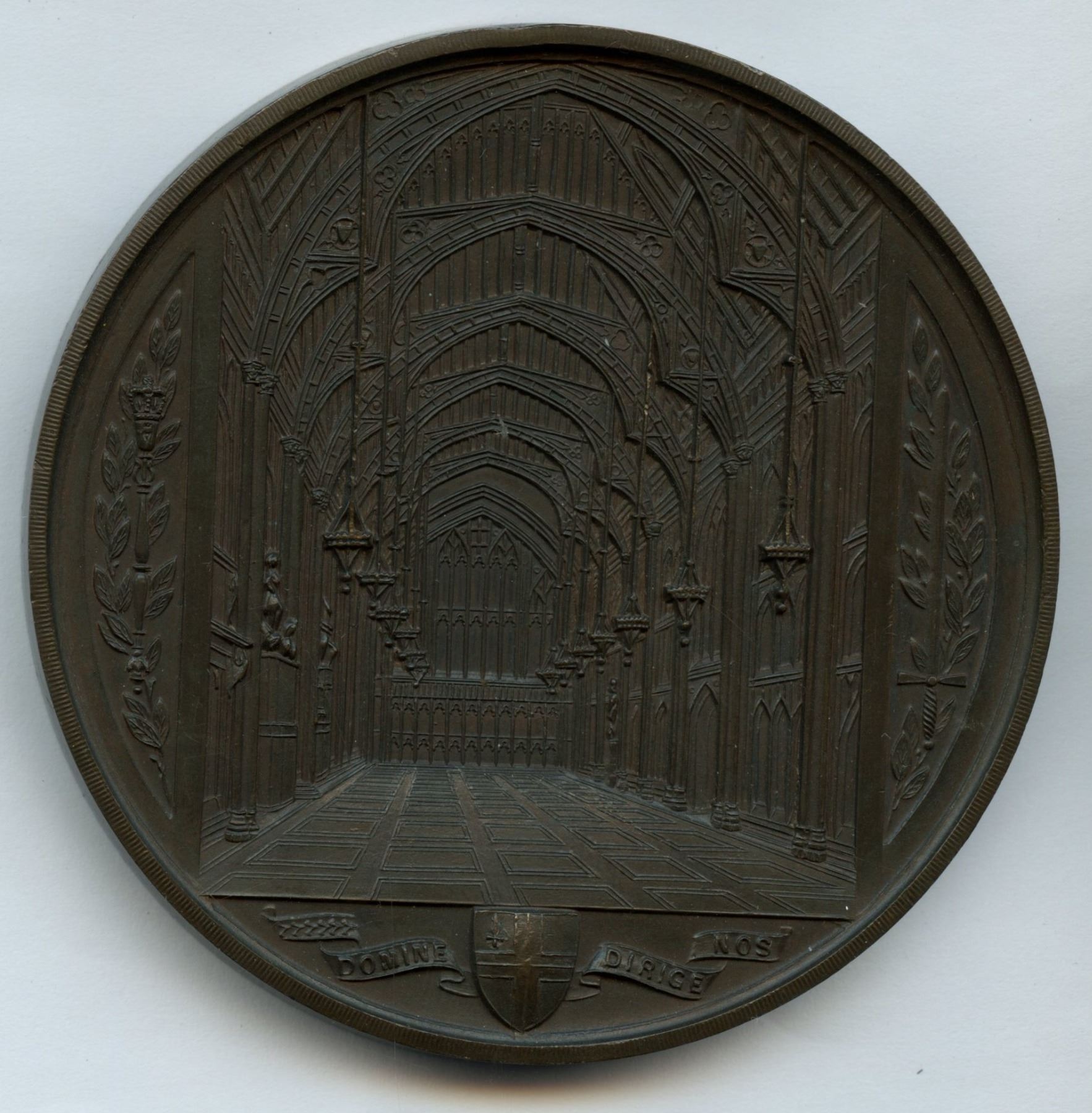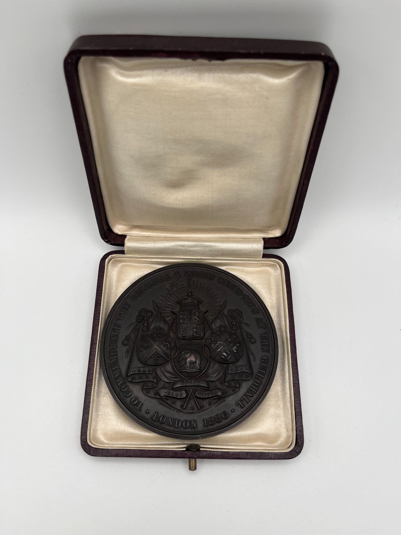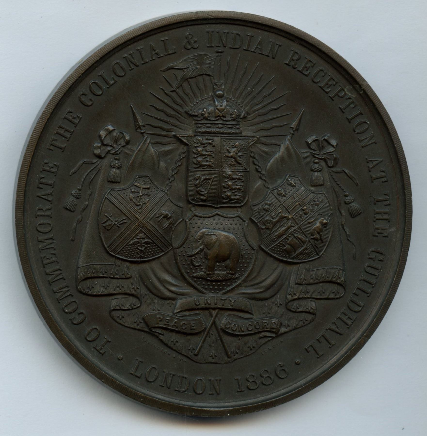 Bronze, struck from a die. Obv.: TO COMMEMORATE THE COLONIAL & INDIAN RECEPTION AT THE GUILDHALL. LONDON 1886. The royal arms ensigned with a crown, with three shields of arms for colonies and India hanging below it with motto UNITY PEACE CONCORD. Rev.: A view of the interior of the Guildhall with the shield of arms of the City of London and motto DOMINE DIRIGE NOS. The Colonial and Indian Exhibition was held at South Kensington in 1886 in a series of purpose built buildings in the indian style. Opened by Queen Victoria, in case.