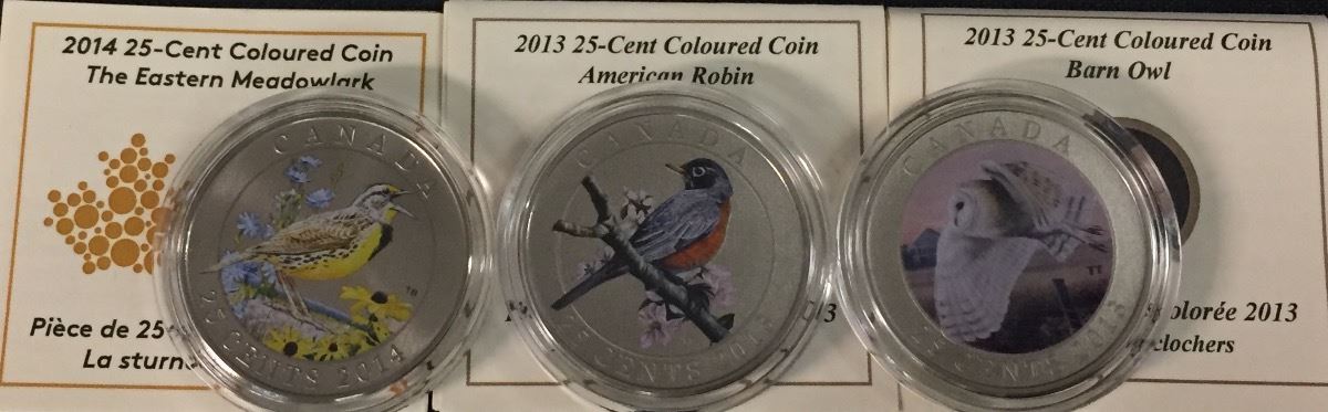 Coloured Birds of Canada 25-Cent Coins - Lot of Three - Includes: Eastern Meadowlark, American Robin, Barn Owl. 3 Pcs.