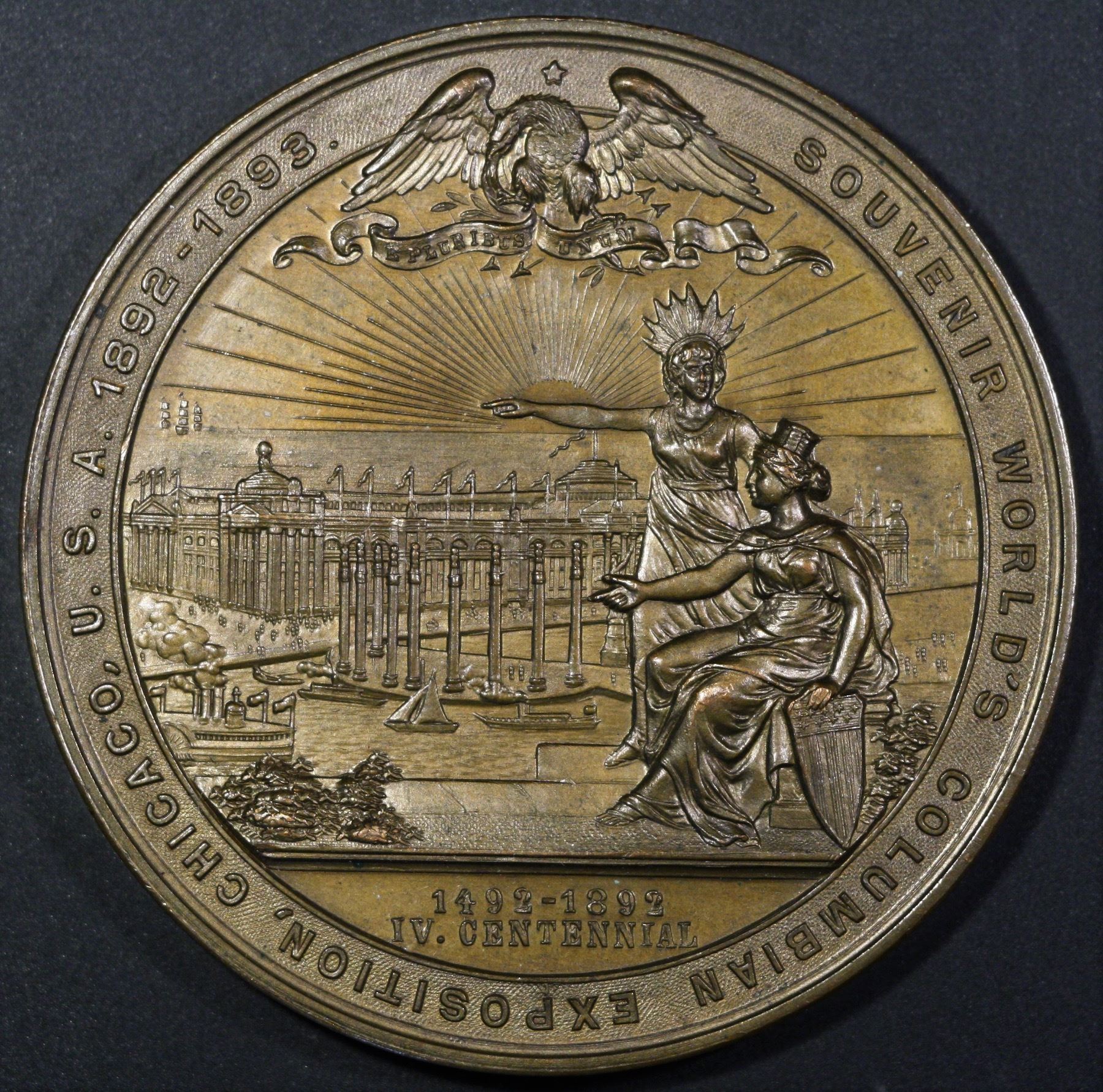 Christopher Columbus commemorative medal issued at the 1893 Columbian Exhibition. The obverse shows the bust of Columbus wearing a solt hat with a rolled-up chart in his hands. The reverse shows 2 female figures, one seated holding a USA shield; the other pointing to an exhibition scene. It is 49 mm in diameter and bronze. It is a beautiful UNC in case of issue.