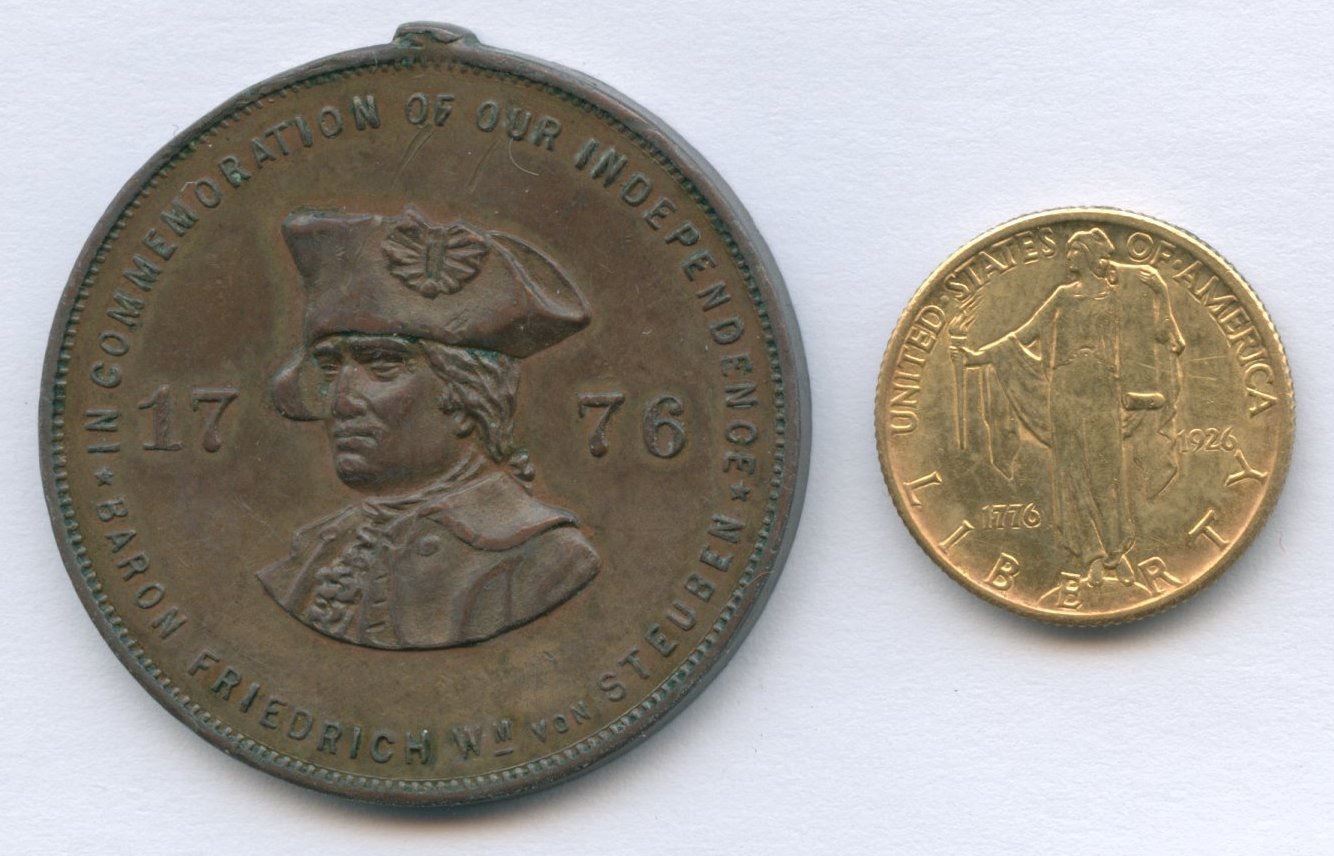 First medal is 1776-1876 In commemoration of Our Independence, bronze, 32.4mm. Second piece is 1776-1926 Sesquicentennial of American Independence quarter eagle commemorative, 18mm, .900 gold, 4.18 gms, only 46,019 coins distributed. 2 pcs.