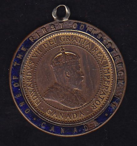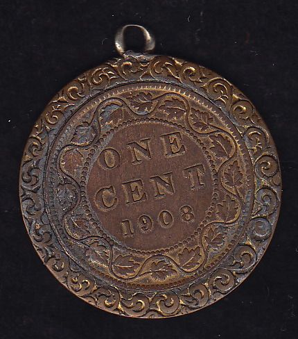 Commemorative Large Cent. 1908 Canada large cent with a brass ring and looped at the top, rev. has blue enamel, EF.