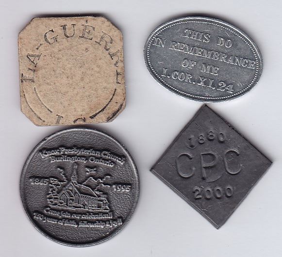 La Guerre, PQ, Cardboard, unlisted, Scarce, CT-unlisted, Cambridge, ON., lead, issued 45, 1880-2000, CPC; CH CT-1945, Galt, Al, issued 500, Burlington, ON.; CH CT-1995, mintage unknown. 4 Pcs.