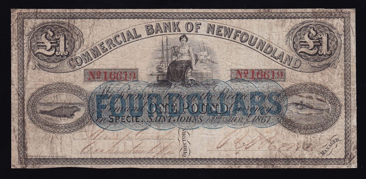 Commercial Bank of Newfoundland $4 (One Pound), 1867
