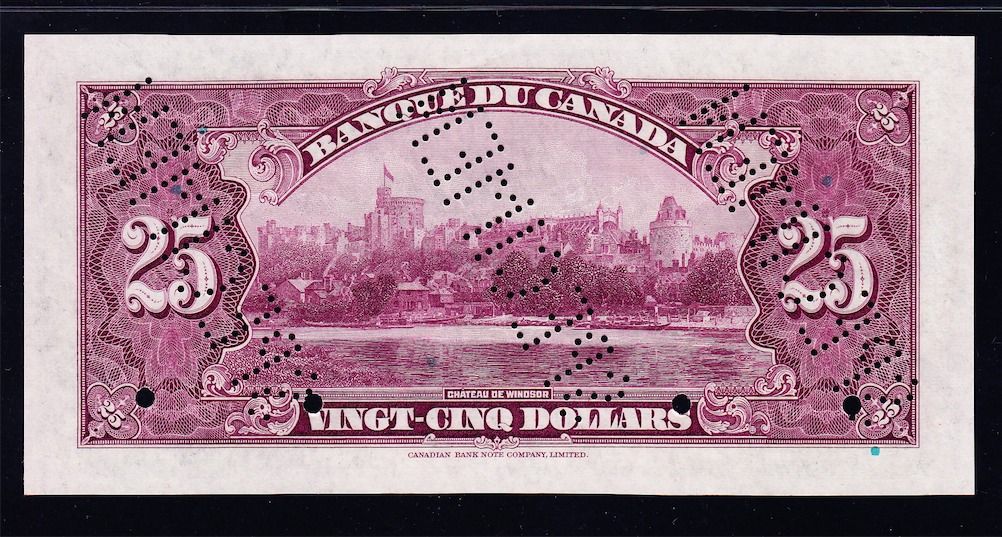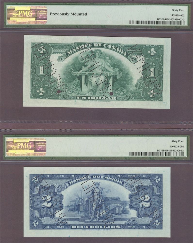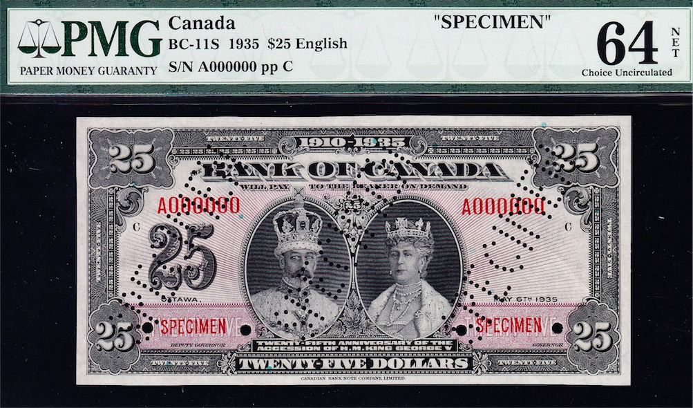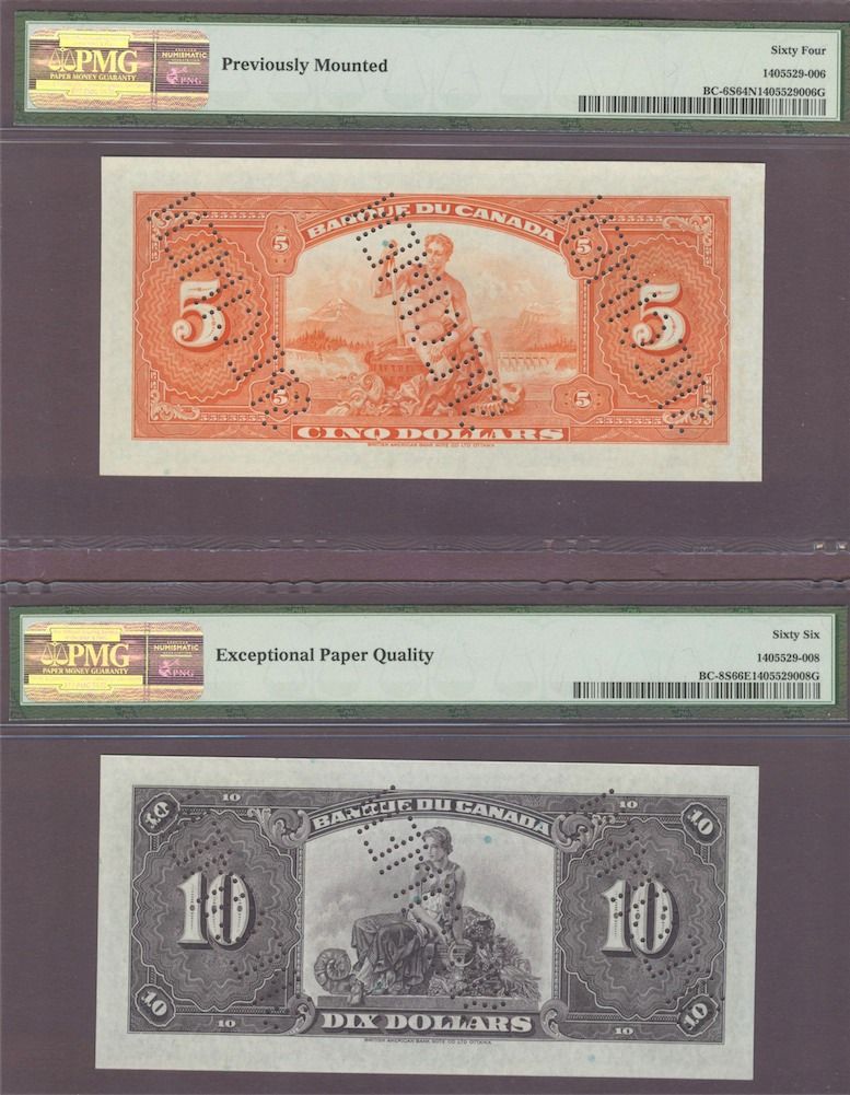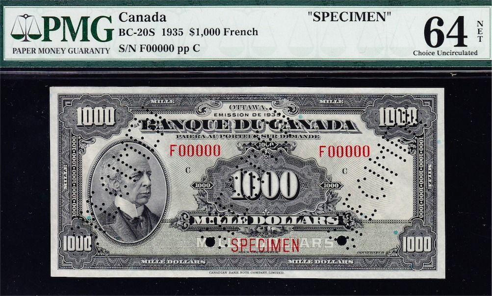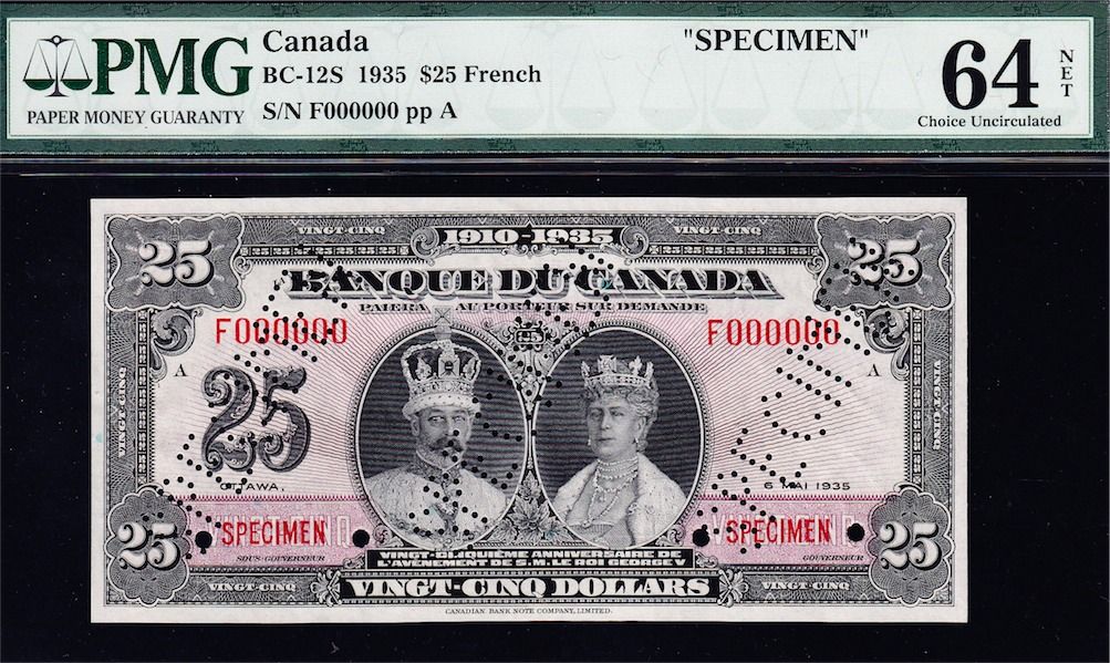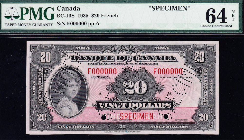 Complete Set 1935 French and English Bank of Canada Specimens - The Charlton Standard Catalogue of Canadian Government Paper Money lists specimens typically as "AU" to be conservative in grading and allow for the usual imperfections associated with specimens. These are all PMG graded and likely the finest set available of the nine sets. Value Estimates - Rarities by definition are seldom offered on the market and therefore are difficult, if not impossible, to price, catalogue value is $122,500. It would be impossible to assemble an issued set of high grade notes. Includes in both French and English $1, $2, $5, $10, $20, $25, $50, $100, $500, $1000. All S/N:F00000, stamped "SPECIMEN" and punched "SPECIMEN". Total 20 Pcs.