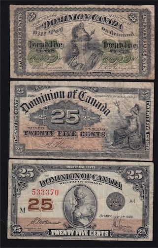 Complete Set of 3 Dominion of Canada Twenty Five Cents - Dates include: CH DC-1c, 1870; CH DC-15b, 1900; CH DC-24c, 1923. All in Fine condition. 3 Pcs.