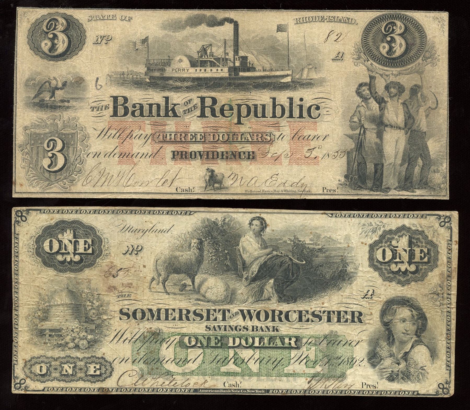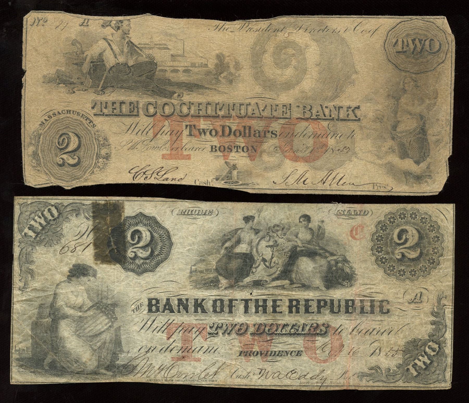 Includes: Bank Republic $3, 1853. Bank Republic $2, 1855. Cochituate Bank $2, 1852. Somerset and Worcester Savings Bank $1, 1862. 4 Pcs.