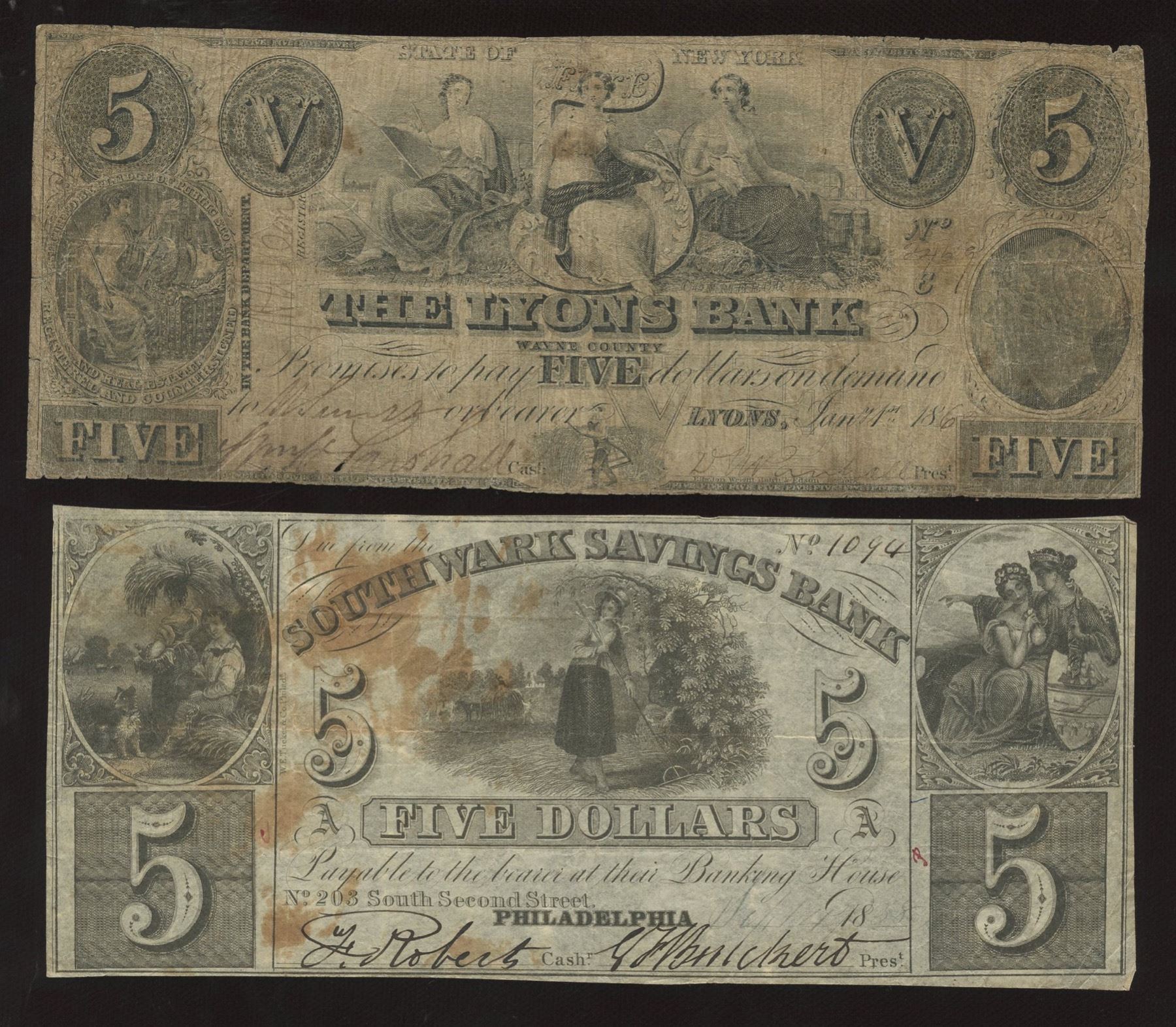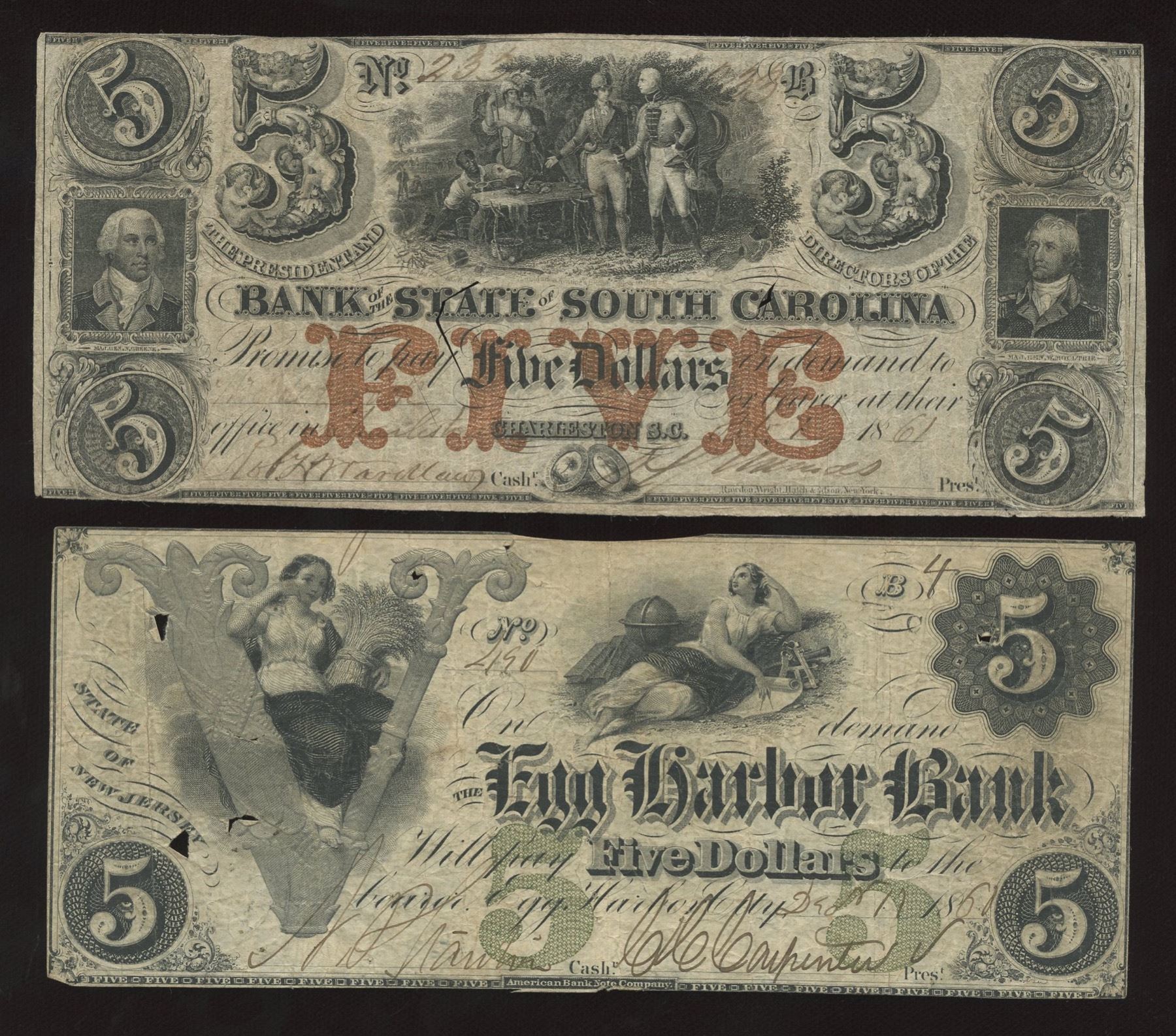 Includes: Lyons Bank $5, 1862. Southwark Savings Bank $5, 1838. Bank of the South of South Carolina $5, 1861. Egg Harbor $5, 1860. 4 Pcs.
