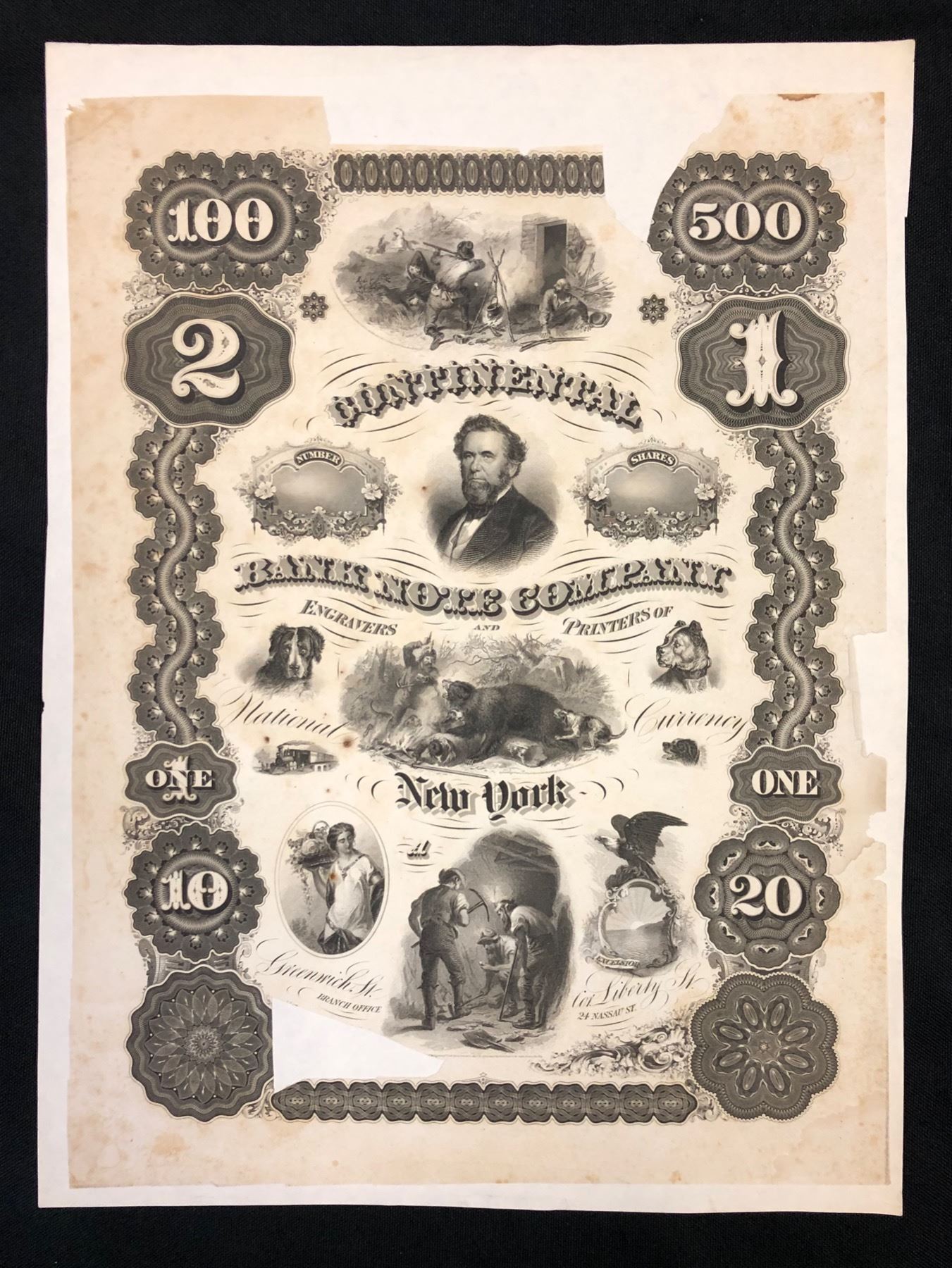 Continental Bank Note Company, Trade Sample Sheet, Proof, mounted on heavier paper. Counters, guilloches and ten vignettes large and small, intaglio printing in black. Pieces missing, including a section cut out at top, and a few age stains, but still a rare and desirable item.