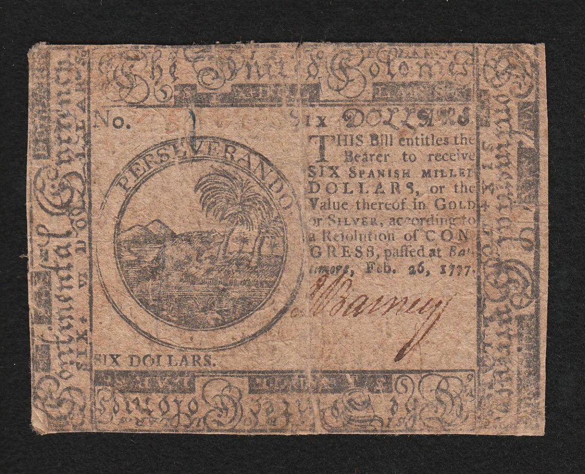 Continental Currency. February 26, 1777. Six Dollars.