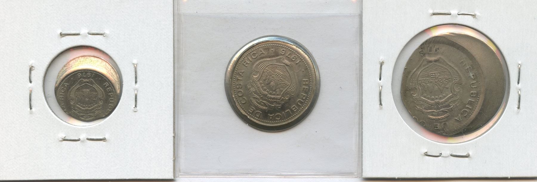 Lot of 3 major striking errors from Costa Rica. 10 centimos, 25 centimos, 50 centimos denomination, all dated 1976 and mint state. Must be seen to be appreciated. Patrick Glassford Collection.