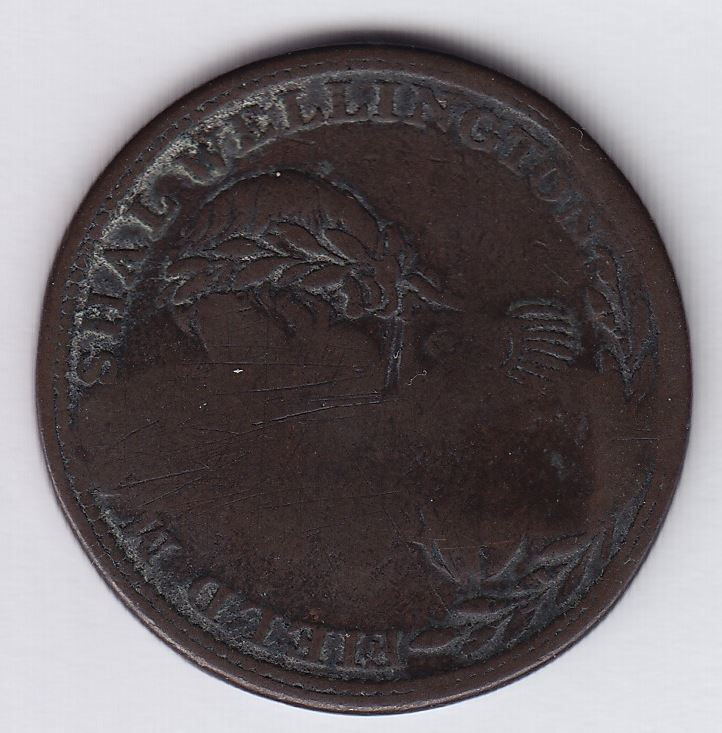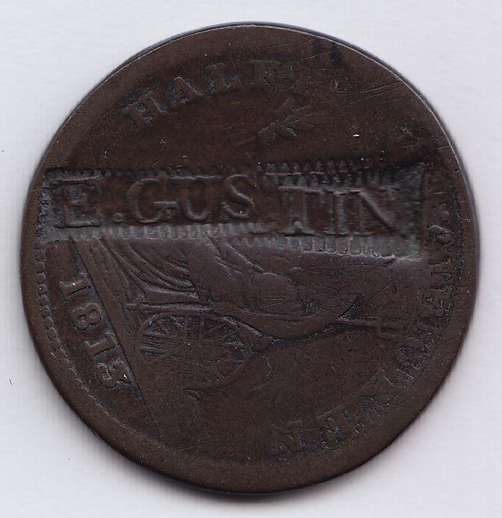 Countermarked Coin E. GUSTIN within serrated cartouche on rev. of Wellington Halfpenny, 1813, BR 969, WB-455.
