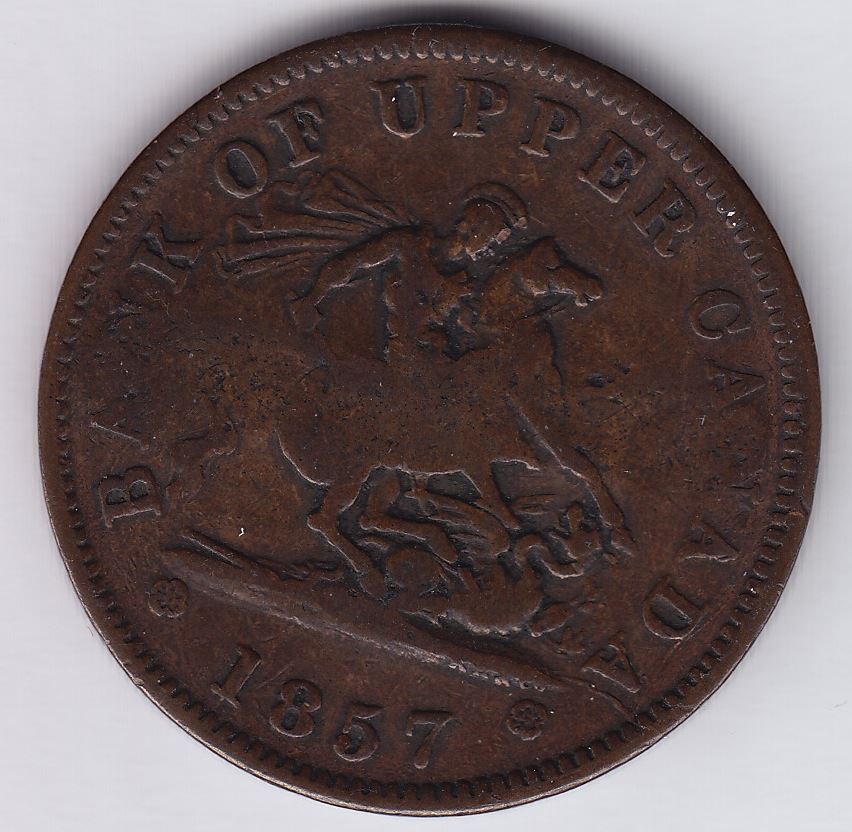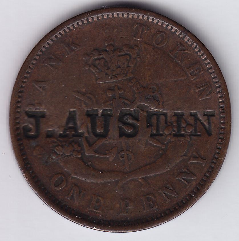 Counterstamp J. AUSTIN on rev. of Upper Canada Penny, 1857, BR 719, unpublished.