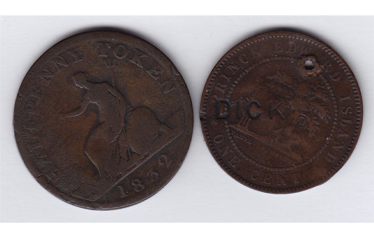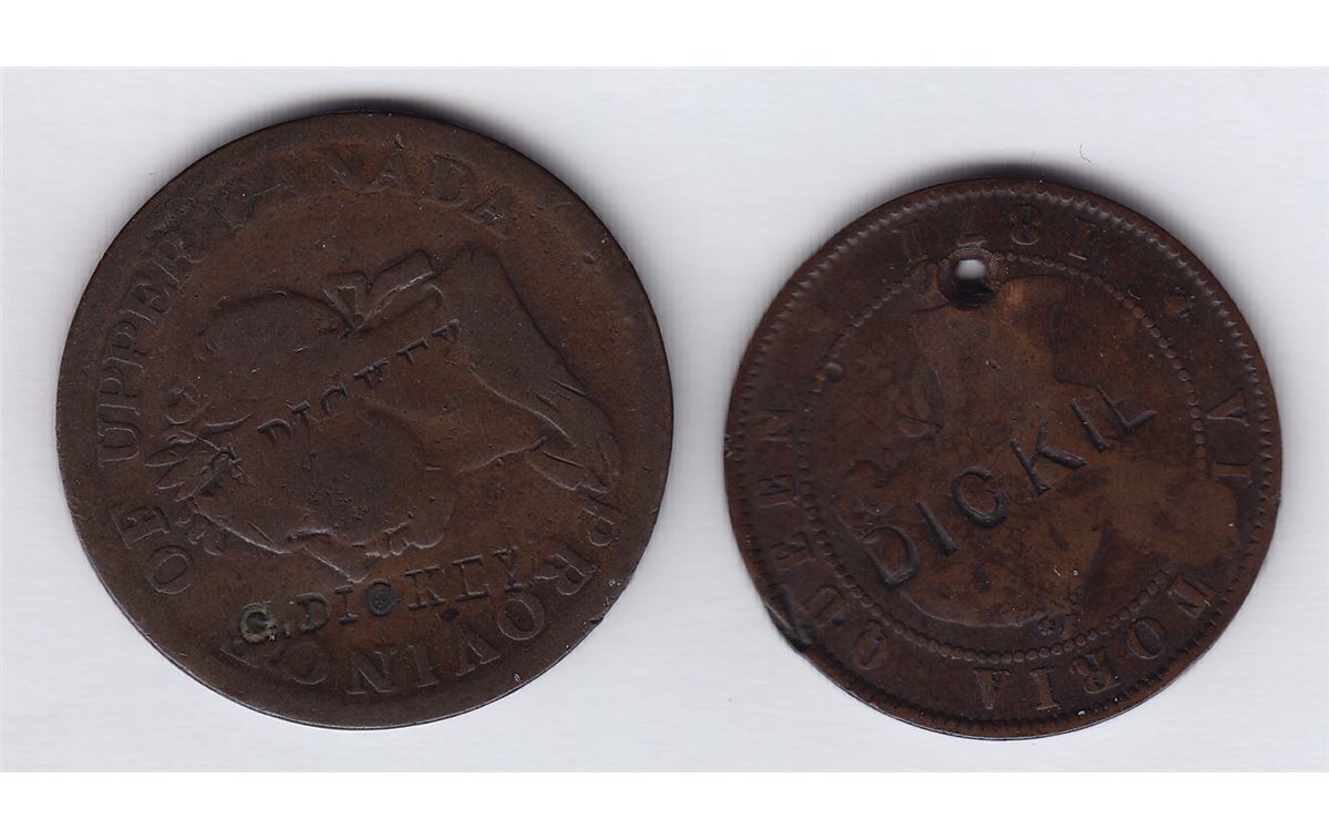 Countermarked Lot G. DICKEY twice on obv. of Province of Upper Canada Halfpenny, 1832, BR 732, WB-354. Brunk unpub. 2nd ed., 11613 is C. Dickey on same coin, perhaps a misreading and the same piece; N. DICKIE on obv. and rev. of Prince Edward Island Cent, 1871, Unpublished. Holed. 2 Pcs.
