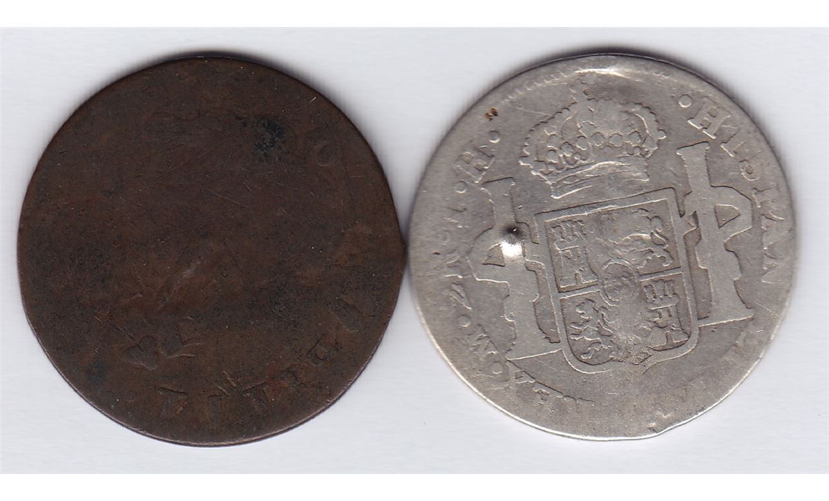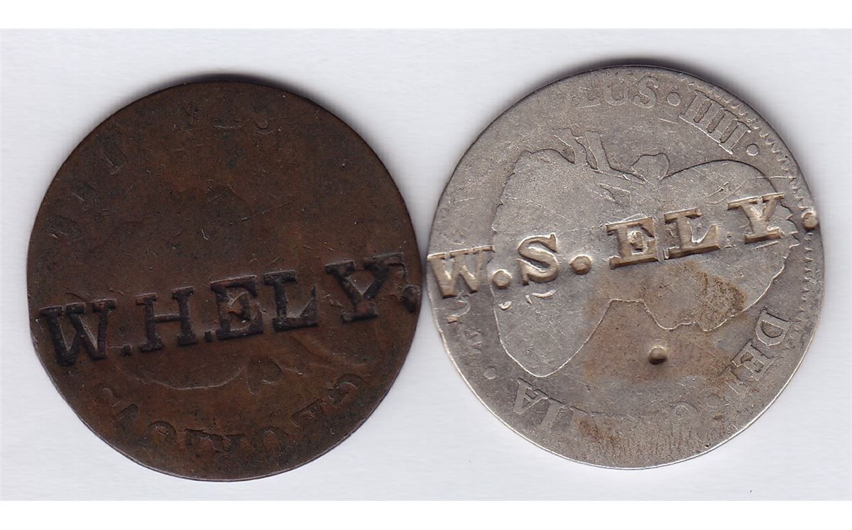 Countermarked Lot W.H. ELY on obv. of Blacksmith copper, Wood 33, WB-386. Brunk unpub. 2nd ed., 13315 (this coin). Ex Baker, Bowers & Merena Sale, March 26, 1987, lot 1130; W.S. ELY. on obv. of Hispania 2 reales, 1794, Unpublished. 2 Pcs.