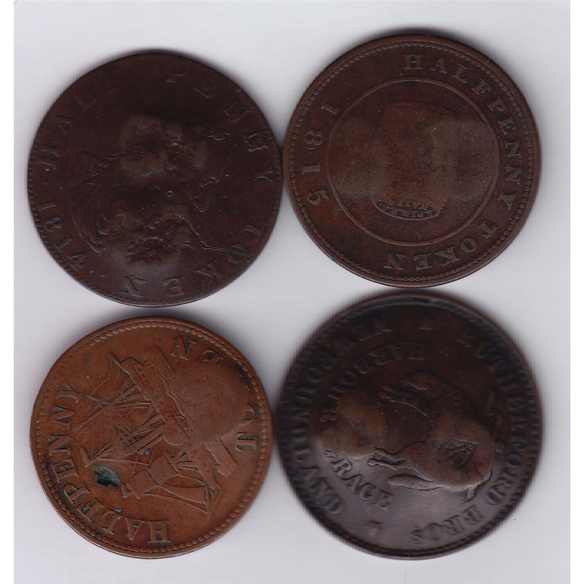 F D on rev. Fisheries and Agriculture Halfpenny, BR 921, WB-1095. Ex Pridmore collection; F D on rev. of Rutherford Halfpenny, 1846, BR 953, WB-1096. Ex Pridmore collection. Appears to be the same mark as 1094, but in a slightly more worn state. 4 Pcs.