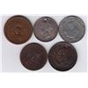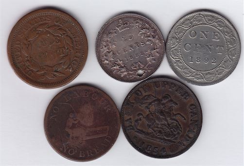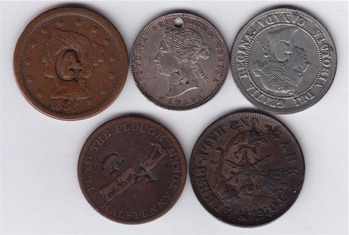 Countermarked Lot G on obv. of U.S. large cent, 1856, WB-423; G. on obv. of Canada Twenty Five Cents, 1882, WB-424. Holed. (Cheramy List); G on obv. of silvered Canada Cent, 1892, WB-425; G A on obv. of No Labour No Bread Halfpenny, BR 1010, Unpublished; G.A.M. twice on rev. on Bank of Upper Canada Halfpenny, 1854, BR 720, Unpublished. 5 Pcs.