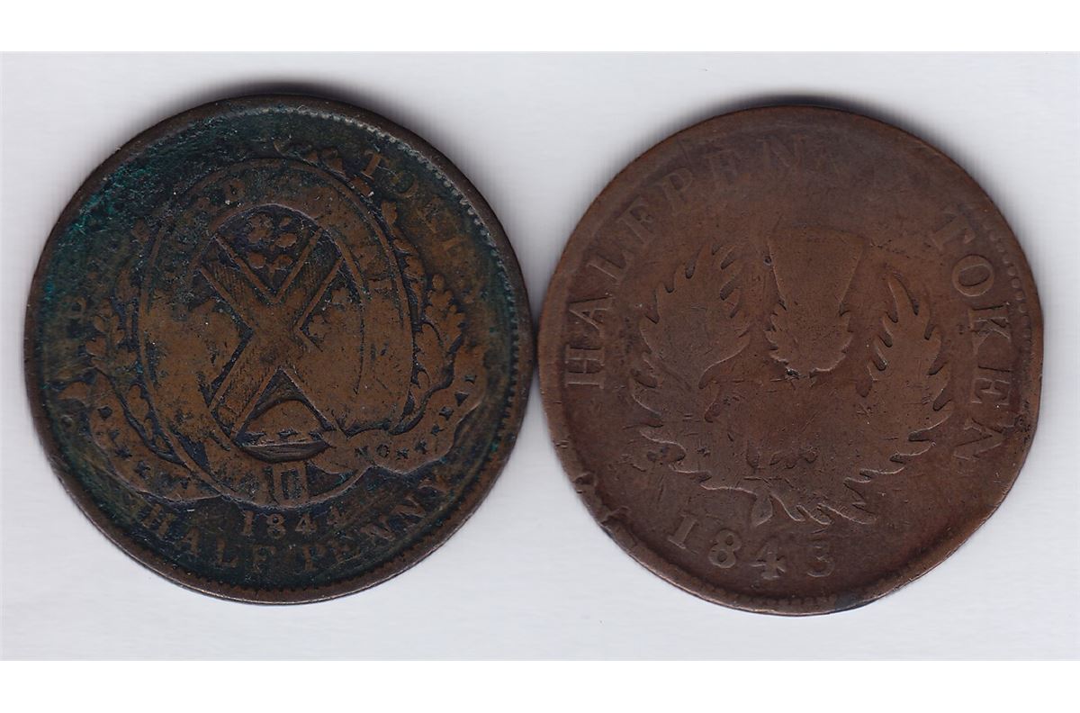 Countermarked Lot G T counterpunched on obv. of Bank of Montreal Halfpenny, 1844, BR 527, WB-434; GWCA. in a rectangular cartouche on a Province of Nova Scotia Halfpenny, 1840, BR 874, Unpublished. 2 Pcs.