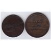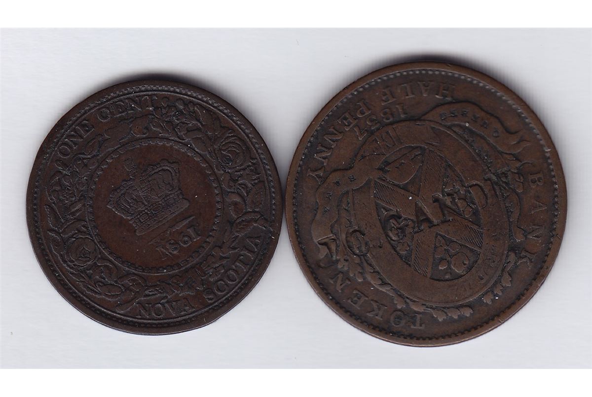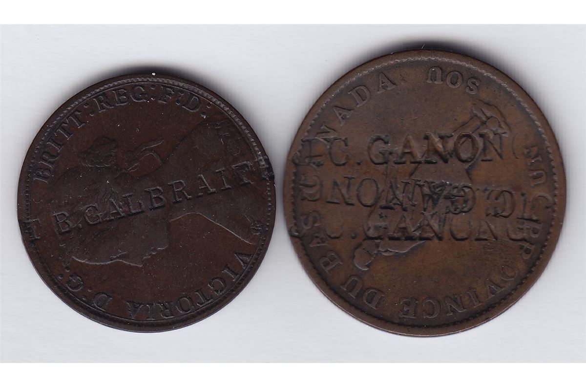 Countermarked Lot T.B. GALBRAITH on obv. of Nova Scotia Cent, 1861, BR 877, WB-438. Rulau Misc.; Brunk 15540 (this coin); J.C. GANONG three times on obv. and once on rev. of Quebec Bank Halfpenny, 1837, BR 522, WB-439. Brunk 15650. 2 Pcs.