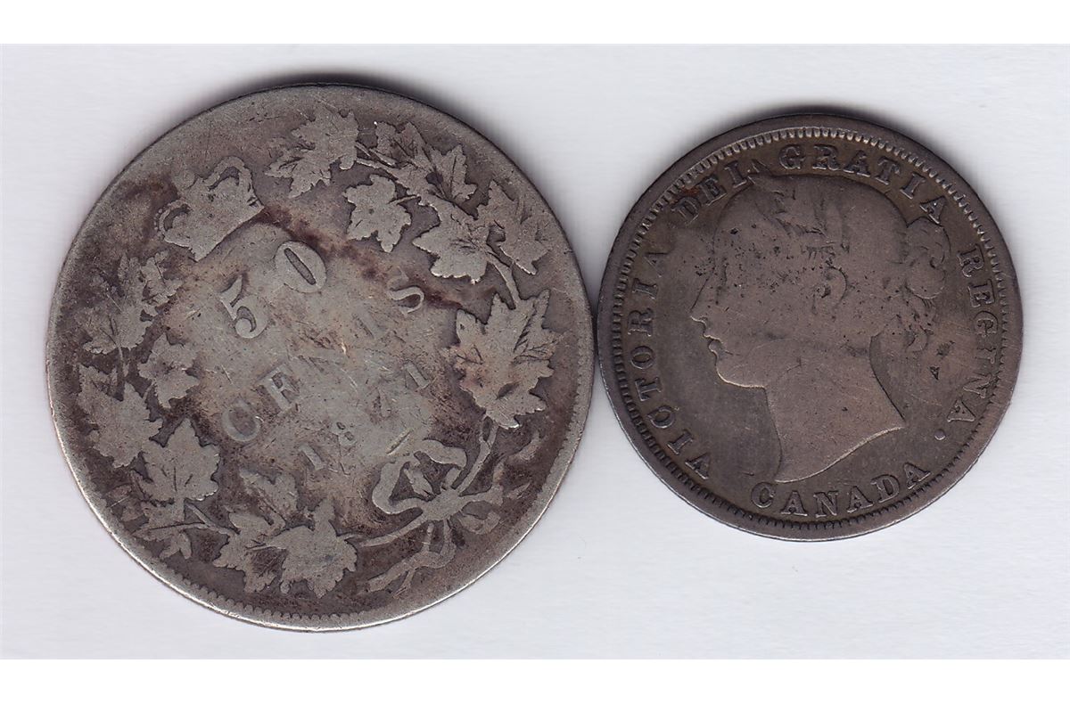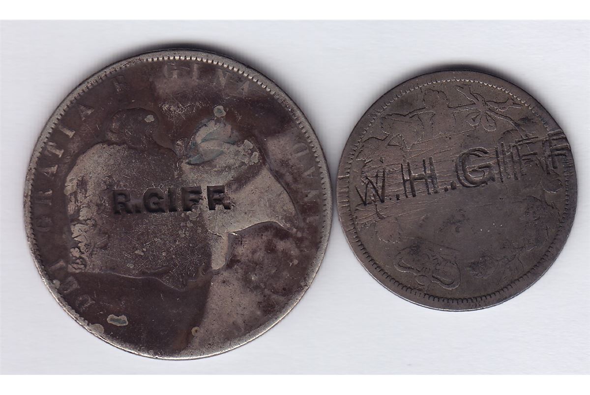 Countermarked Lot R. GIFF on obv, of Canada Victoria Fifty Cents, 1871, BR 940, Unpublished; W.H. GIFF double stamped on rev. of Canada Twenty Cent, 1858, BR 863, Unpublished. 2 Pcs.