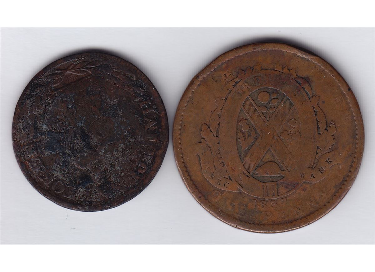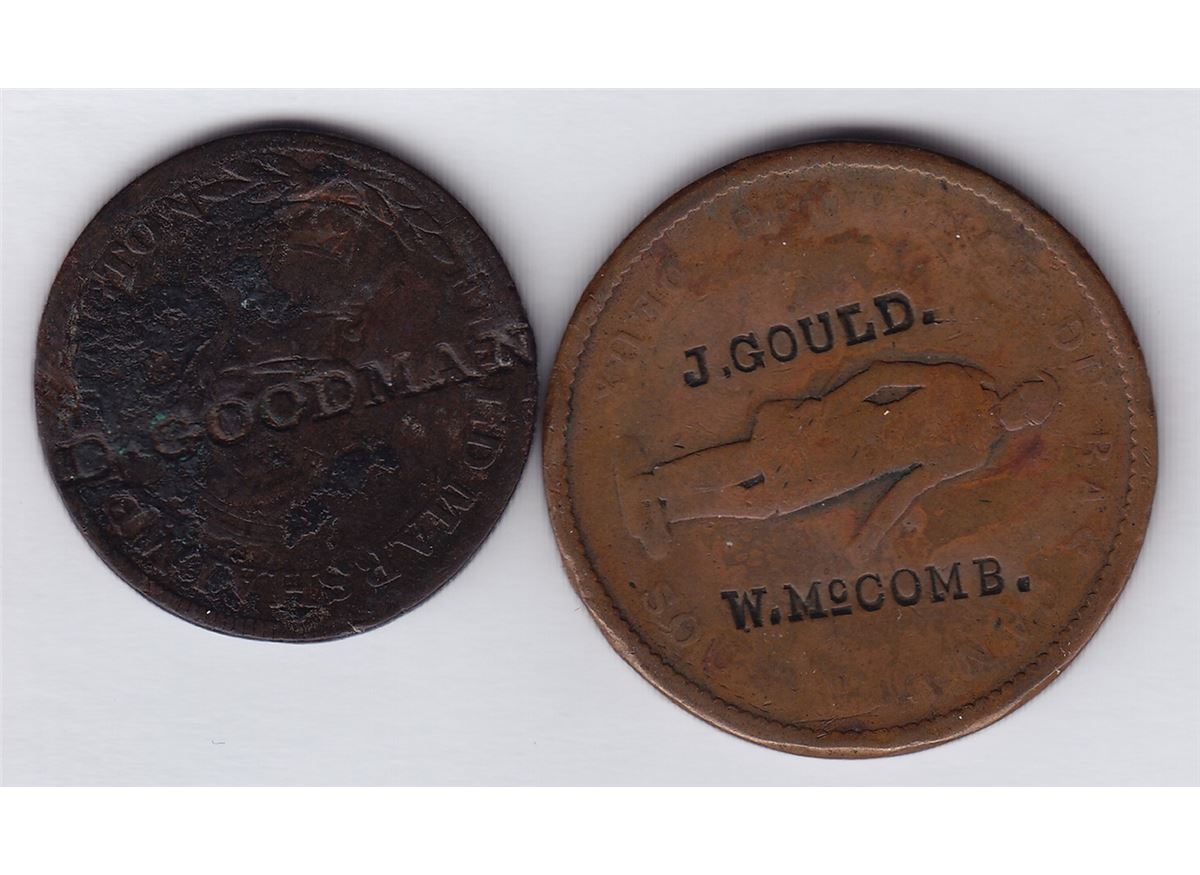 Countermarked Lot D. GOODMAN on obv. of Field Marshal Wellington Halfpenny, BR 971, Unpublished; J. GOULD and W. McCOMB. on obv. of Quebec Bank Penny, 1837, BR 521, WB-448. Brunk has listings of both names on separate coins (16705 & 26695). 2 Pcs.