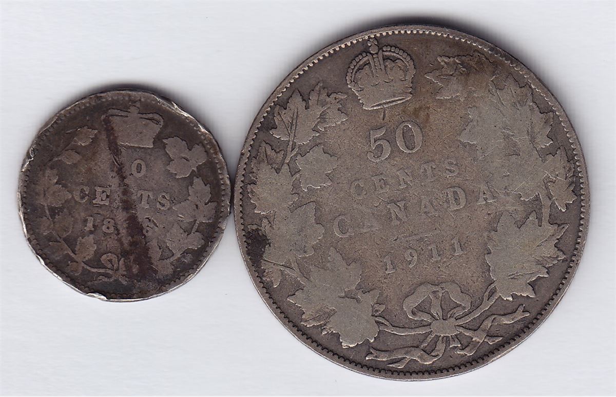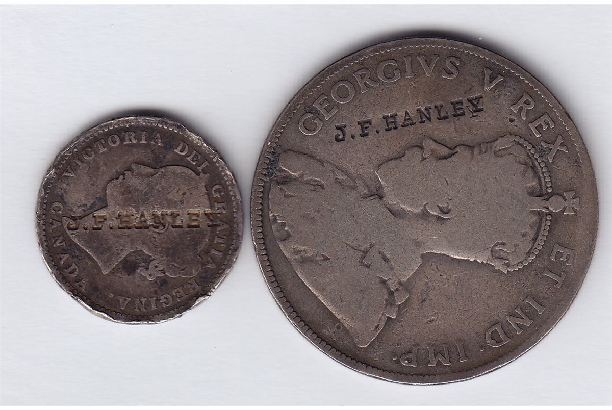 Countermarked Lot J.F. HANLEY on obv. of Canada Ten Cents, 1858, WB-467. Rulau Misc.; Brunk 18080 (this coin); J.F. HANLEY on obv. of Canada Fifty Cents, 1911, WB-468. Brunk 18080. 2 pcs.