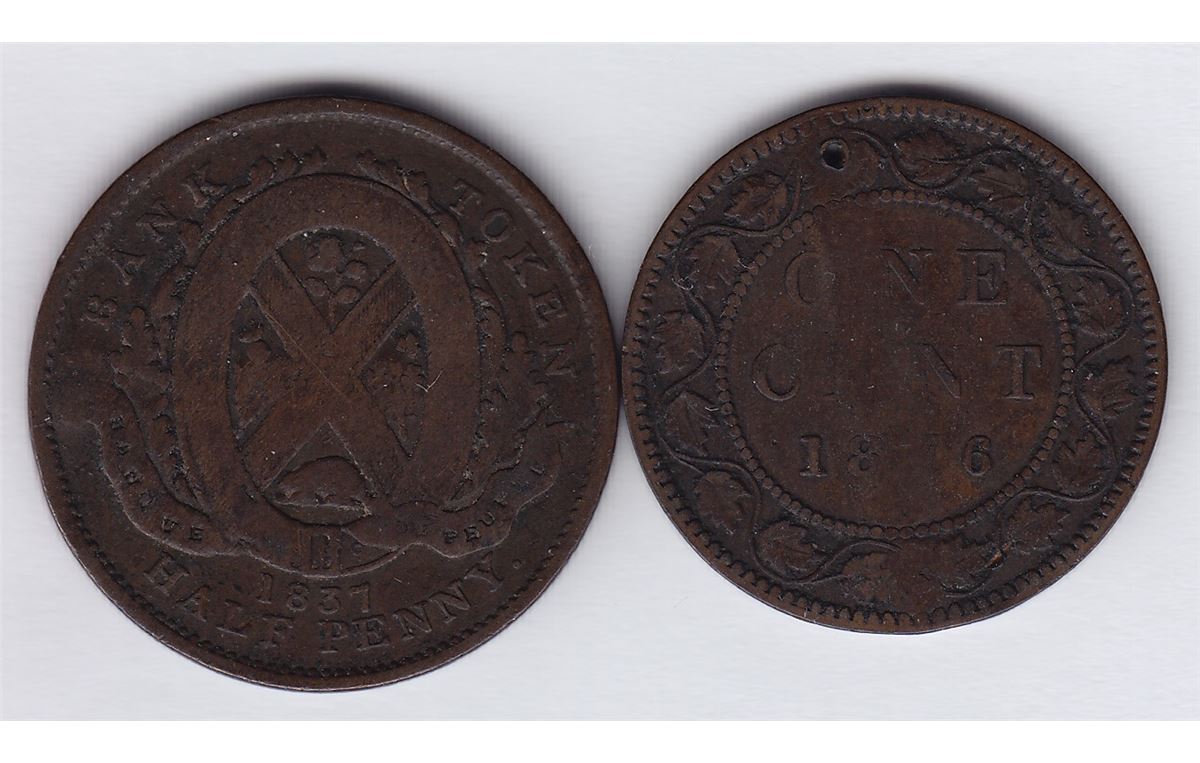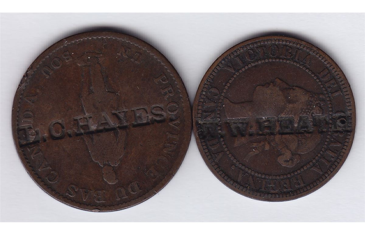 Countermarked Lot L.C. HAYES. on obv. of Banque du Peuple Halfpenny, 1837, BR 522, WB-474; W.W. HEATH on obv. of Canada Cent, 1876, WB-476. 2 Pcs.
