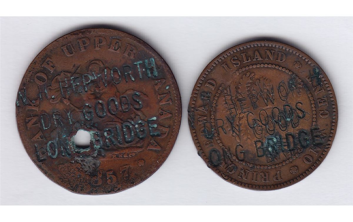 Countermarked Lot W.H. HEPWORTH / DRY GOODS / LONG BRIDGE on obv. of Bank of Upper Canada Halfpenny, 1857, BR 720, WB-481. Holed; W.H. HEPWORTH / DRY GOODS / LONG BRIDGE on rev. of Prince Edward Island Penny, 1871, BR 915, WB-482, Rare. 2 Pcs.