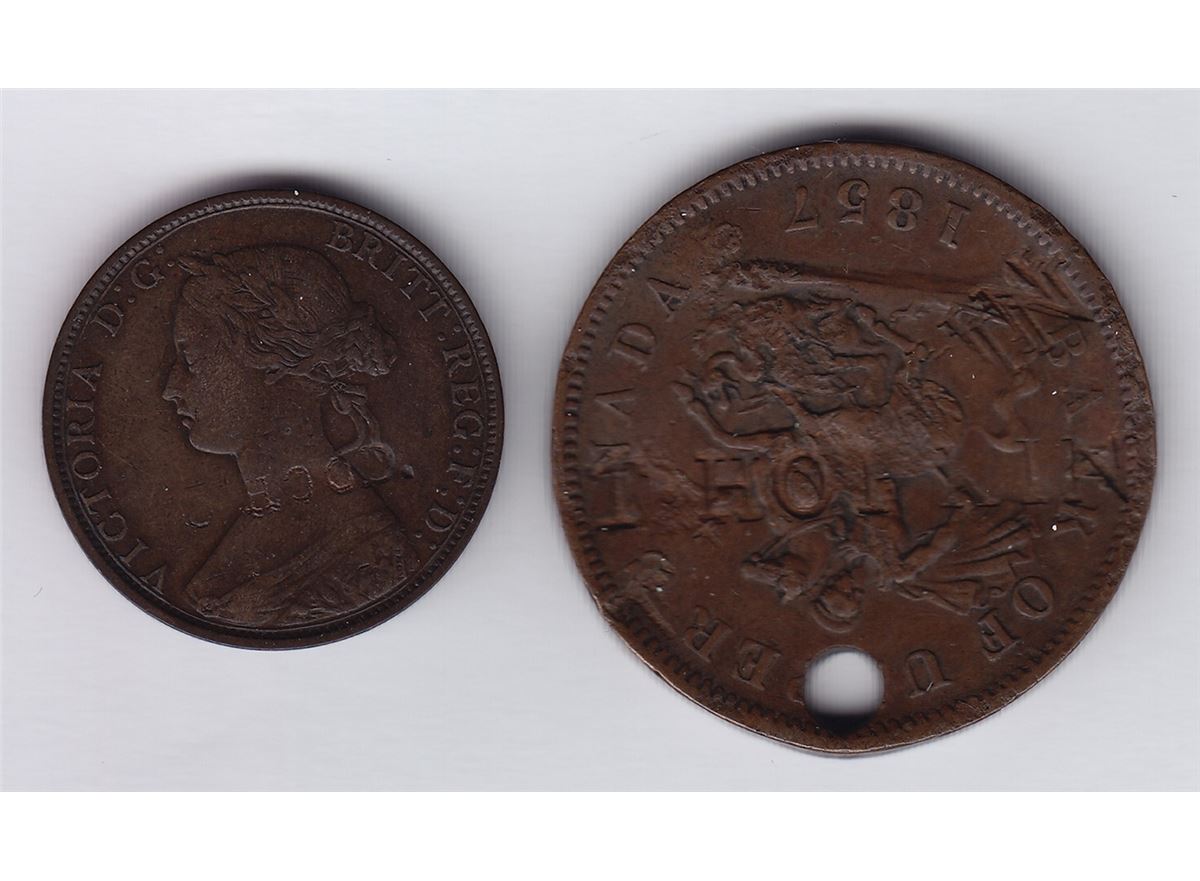 T. HOPKIN twice on obv. & once on rev. of Bank of Upper Canada Penny, 1857, BR 719, WB-498. Brunk unpub. 2nd ed., 20023 (this coin). Holed. 2 Pcs.