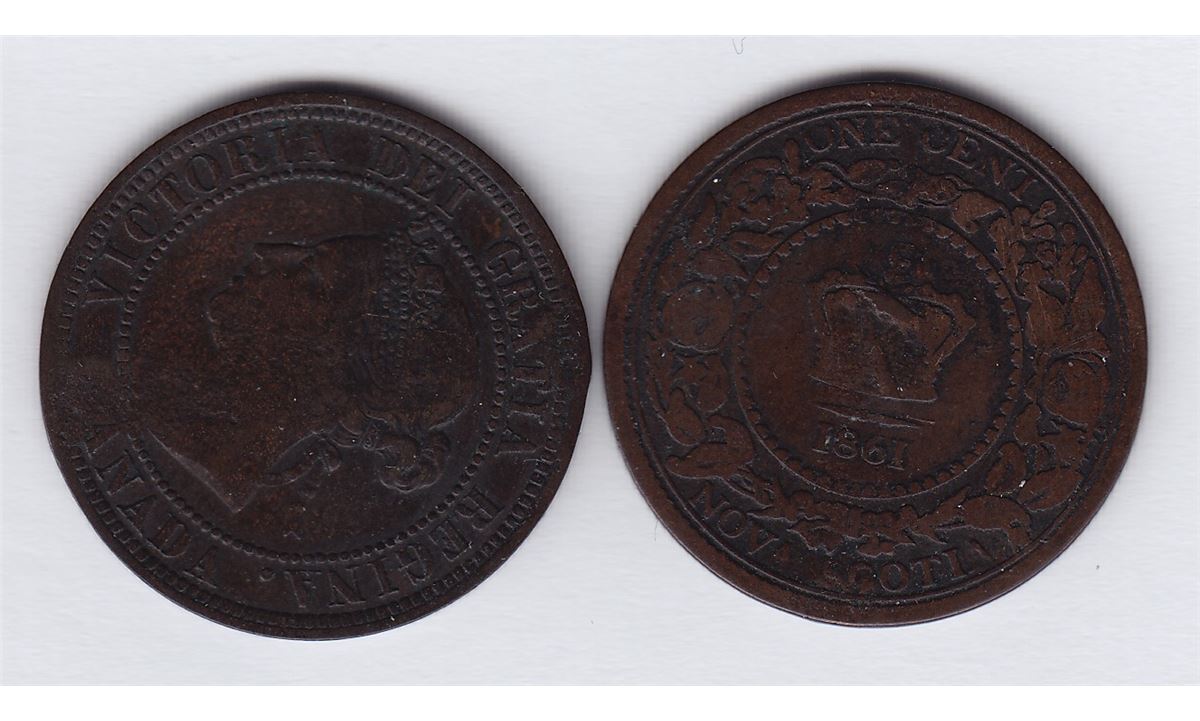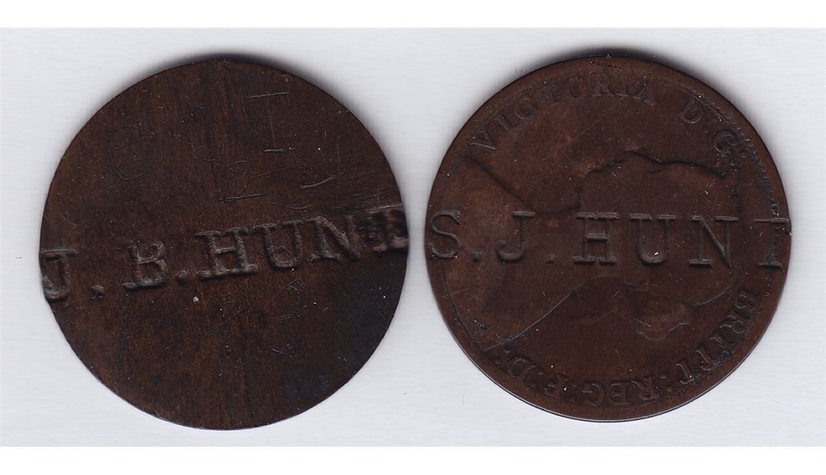 Countermarked Lot J.B. HUNT on planed rev. of Canada Cent, the rev. has the date "Oct. 24,1893 scratched in, WB-505; S.J. HUNT on obv. of Nova Scotia Victoria Cent, 1861, BR 908, Unpublished. 2 Pcs.