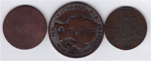 Countermarked Lot J on obv. of Wellington Halfpenny, 1816, BR 981, WB-514; J. B three times on obv. of Nova Scotia Penny, 1856, BR 875, WB-515; J.B on obv. of Ships Colonies & Commerce Halfpenny, BR 997, WB-516. Foster Part II, 121; Rulau Misc. (likely this coin). The masks, waves, and flag have been engraved. Holed. 3 Pcs.