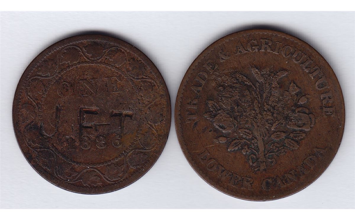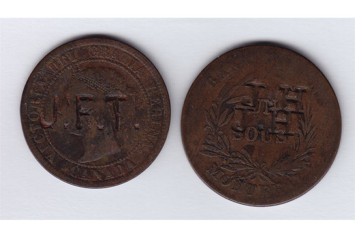 Countermarked Lot J.F.T. on obv. & rev. of Canada Cent, 1886, WB-525. Rulau Misc;