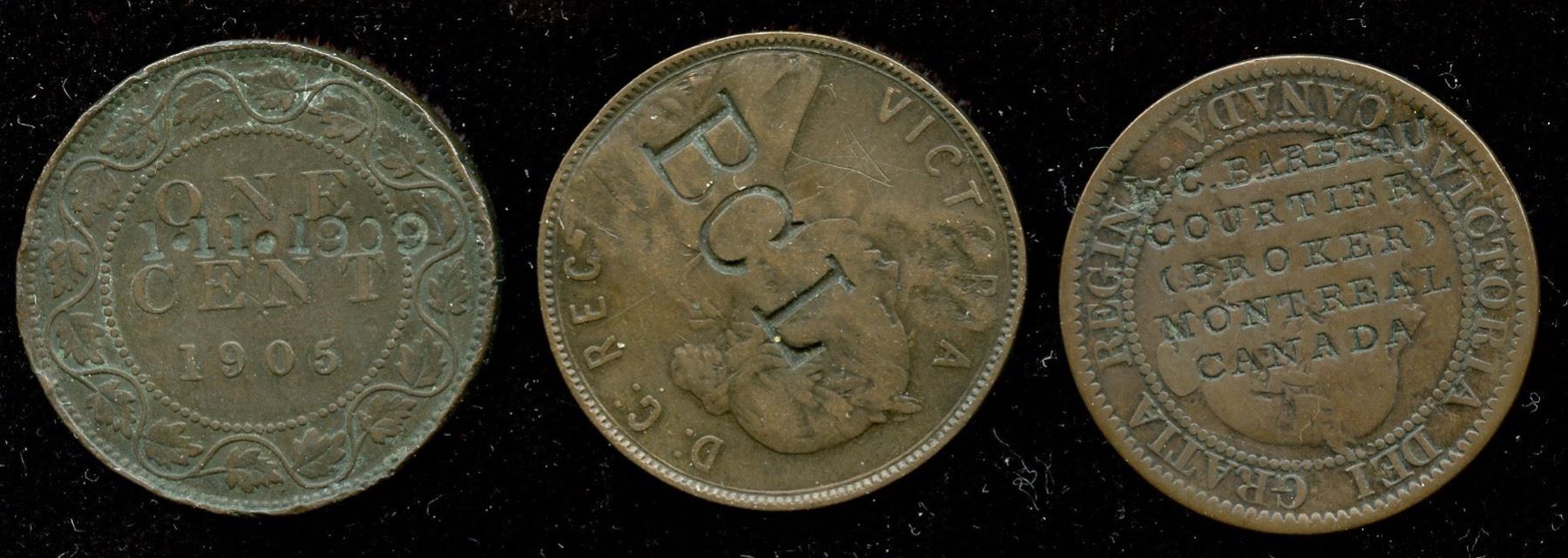 20/3/99 on rev and BCL on obv, host 1880 Newfoundland cent; 1/11/1909 on rev, host 1905 Canadian large cent; L.C. Barbeau/Courtier/(Broker)/Montreal/ Canada, host 1859 Canadian large cent (3 pcs)