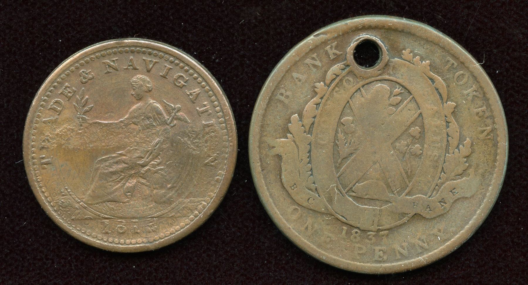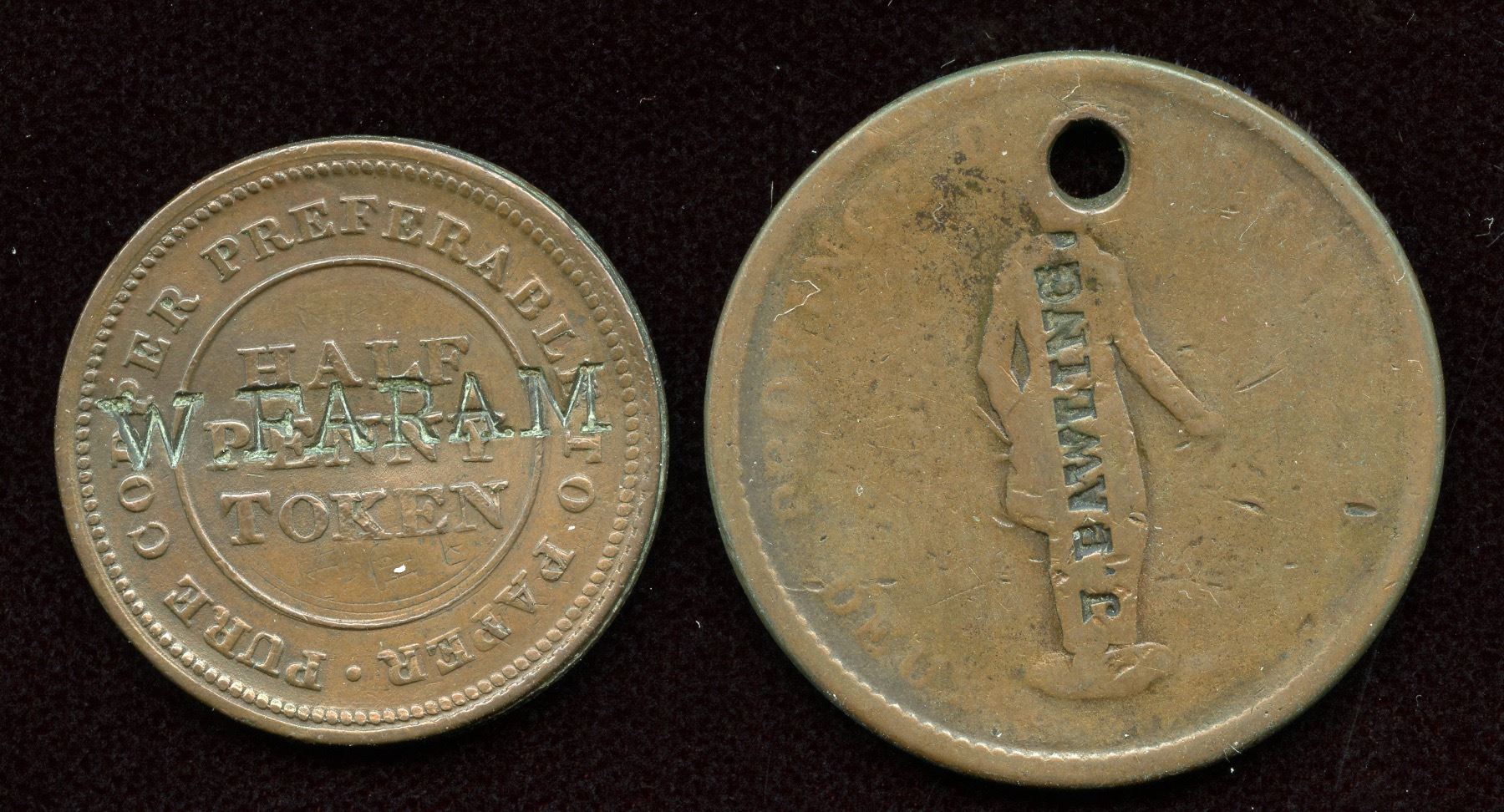 W. Faram counterstamped on reverse of Br. 963 Trade & Navigation 1813 halfpenny, Unpublished; J. Pawling counterstamped on Br. 521 Habitant 1837 Penny, Unpublished. 2 pcs.