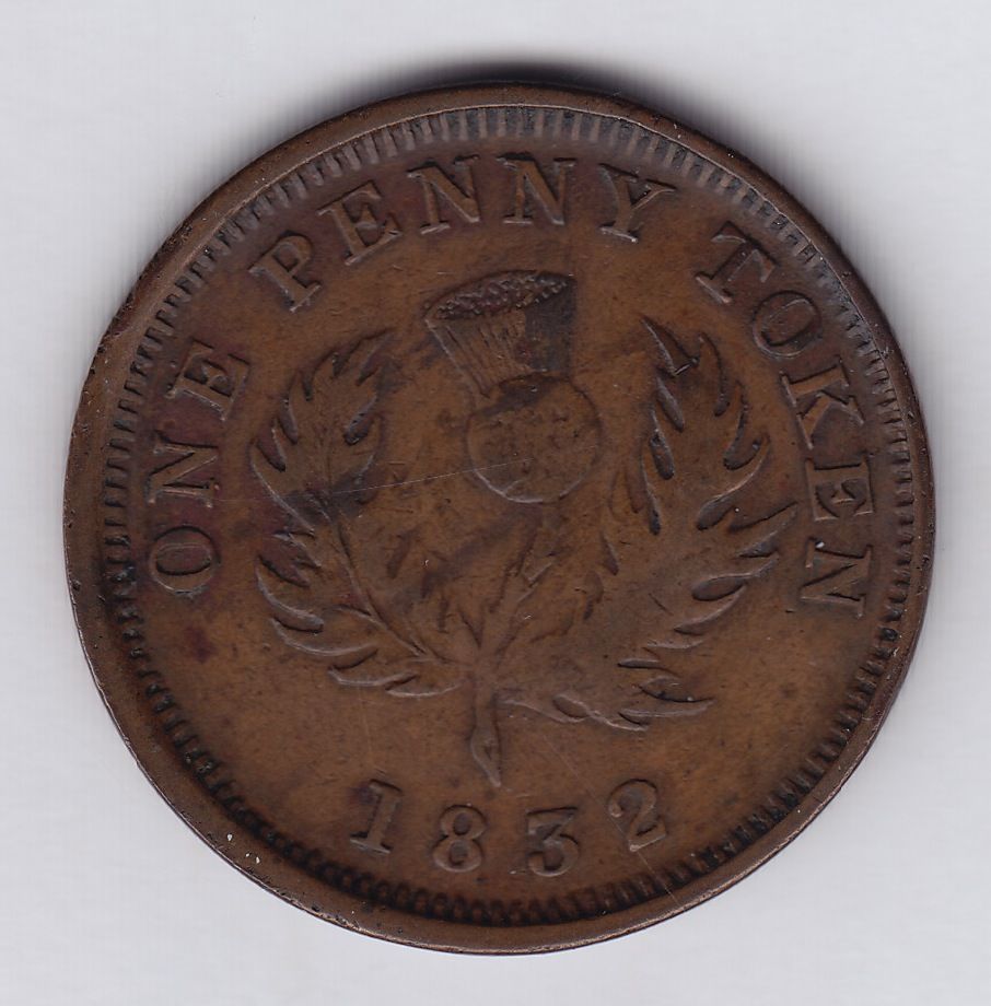 Courteau 288 - Co 288, Br 870, CH NS-4A3, 1832 One Penny, VF. Token appears to be brass.