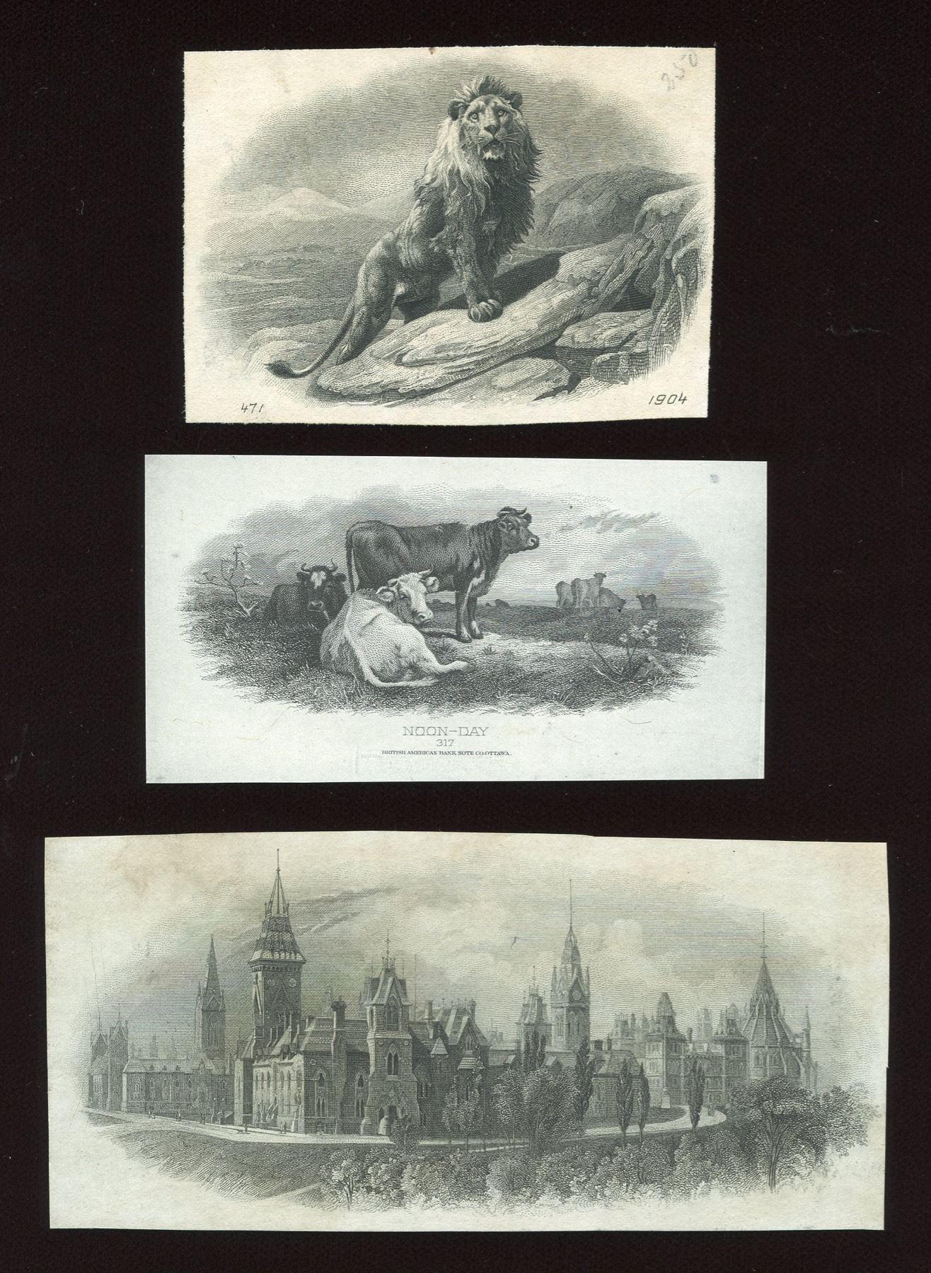 Crown Bank of Canada, BABN vignette "Noon-day" (cattle) on $5, and lion on $10 with printed date 1904, with light pencil notation; Parliament buildings vignette on $50. Three die proof vignettes.
