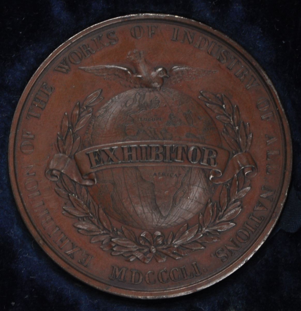 44mm, Bronze. 1851 Exhibitor's medal, "United Kingdom Class 8 No. 316, given to the firm Hodgson, Moses for their exhibit of a model of a pilot coble with its oars, sail and other appointments. Eimer 1459. Unc in damaged case of issue.