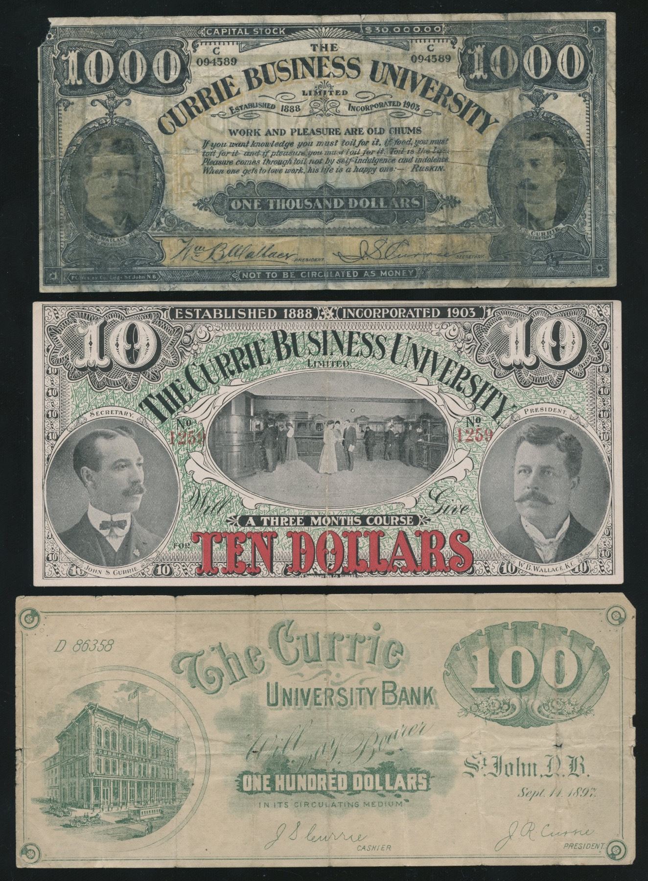 Includes: A) $1,000.00 Fine with edge tears and a corner removed, Schingoethe NB-350-adv.B. B) $10.00, AU, Schingoethe NB-300-adv.A, Obv. University officials pictured with a bank interior scene in the center, the Rev. group photos of students with university advertising. C) The Currie University Bank, NB. $100. Fine, holes and edge nicks. 3 pcs.