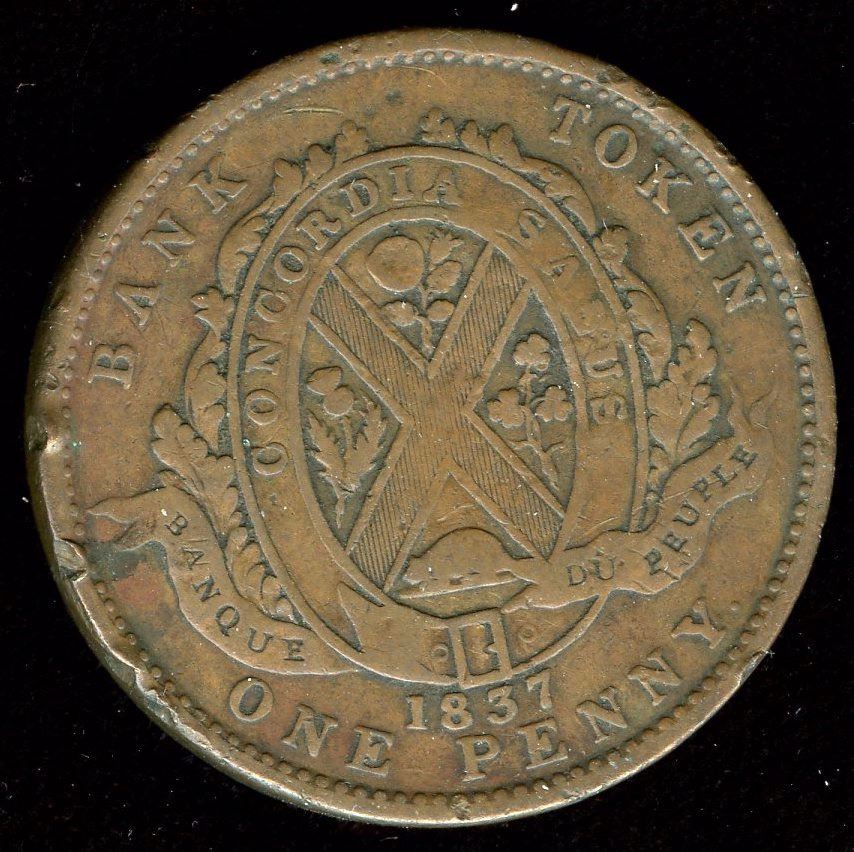 A Devins & Bolton Token - A Lower Canada One Penny Token of 1837 "Banque Du Peuple" on ribbon, with Type 2 counterstamp on obverse from the Montreal druggists, Devins & Bolton
