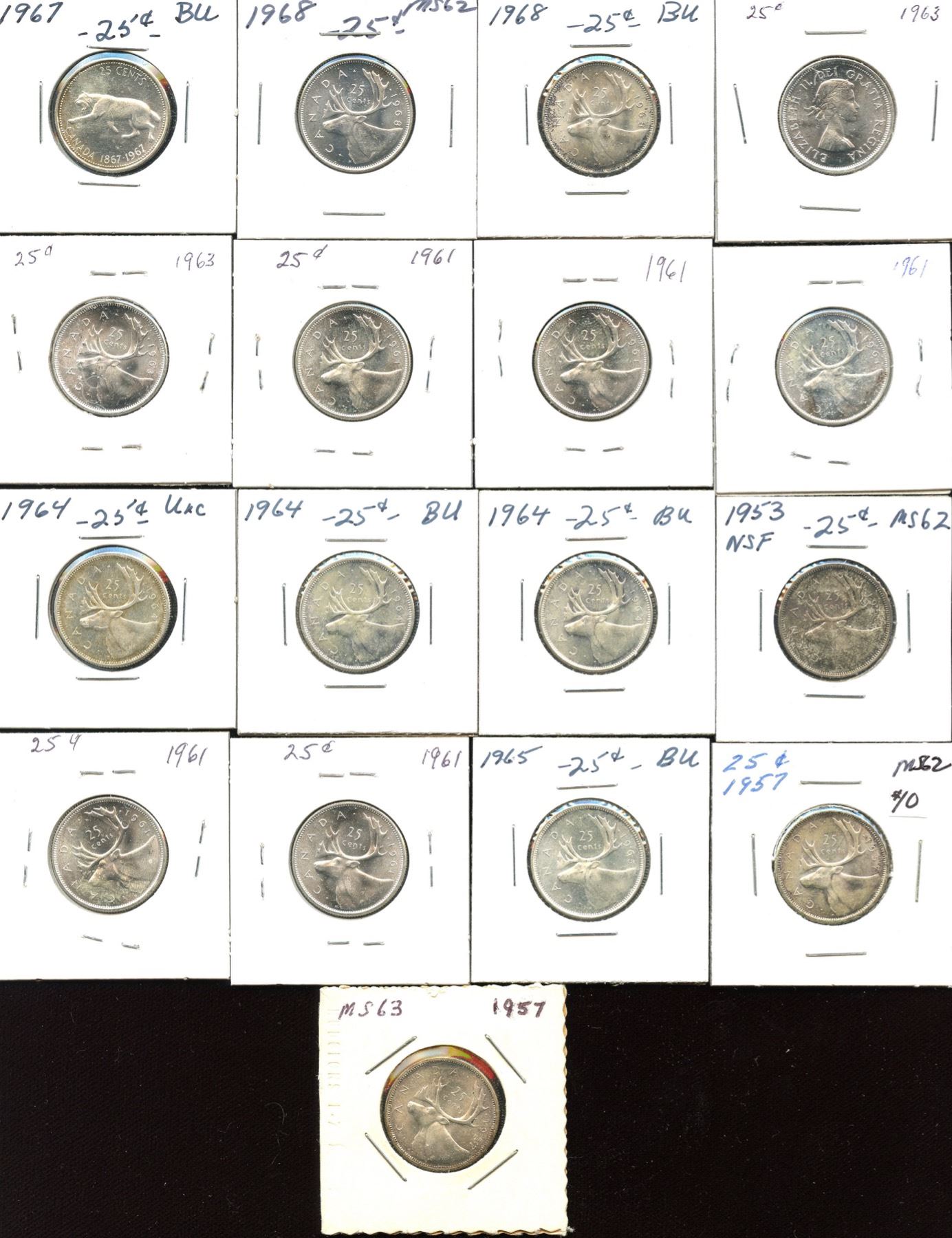 Dealer lot: 17 mint state Elizabeth II silver 25c coins, 1953 to 1968, some duplicates, all coins are BU.