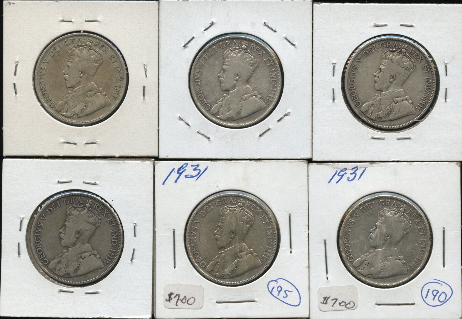 Dealer lot: 6 George V 50c, nice VG grades (lot includes 1919 (1), 1929 (1), 1931 (4). 6 Pcs.