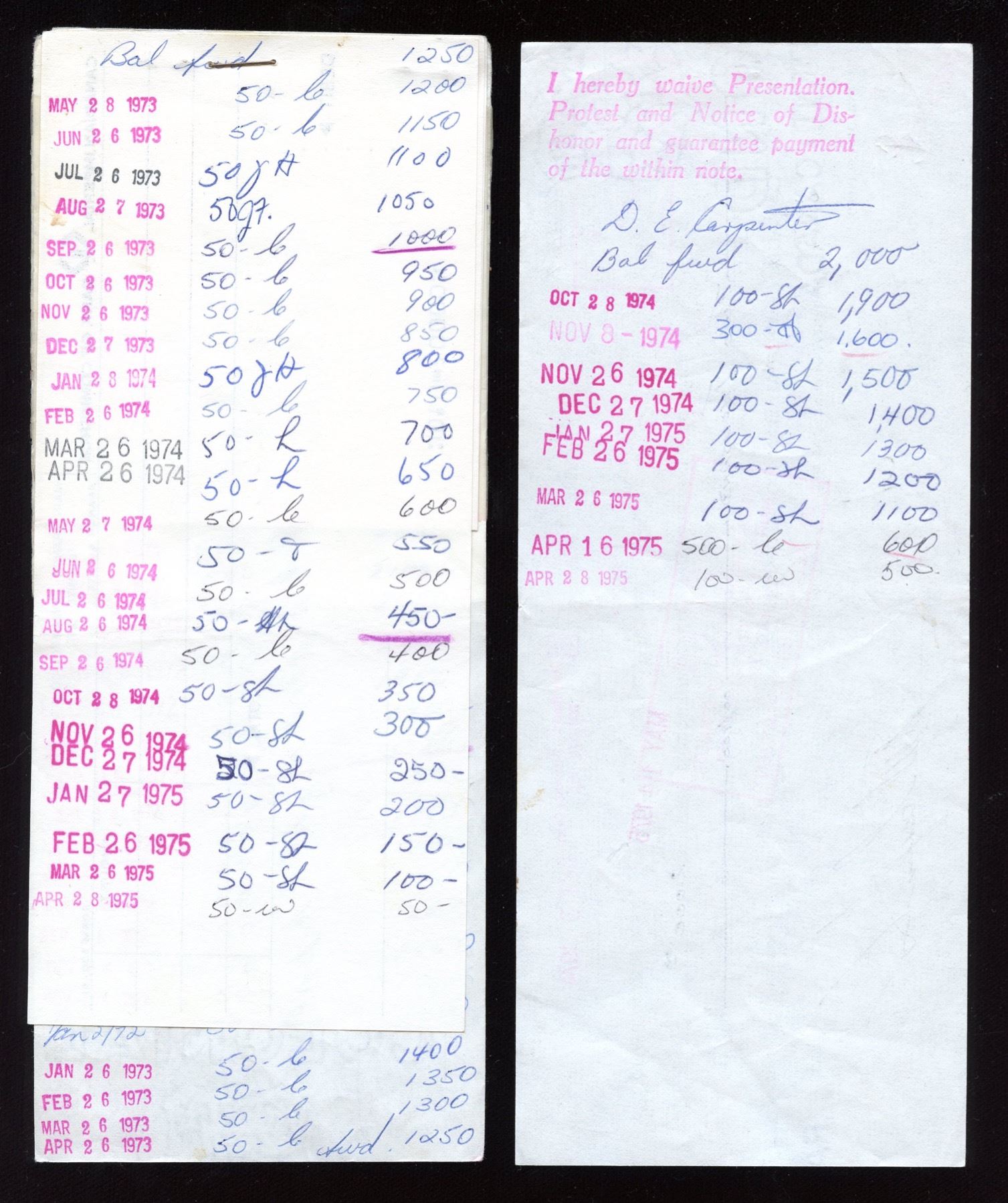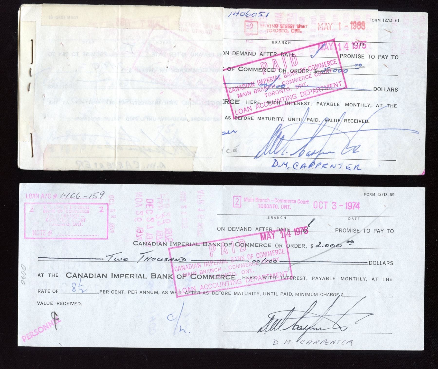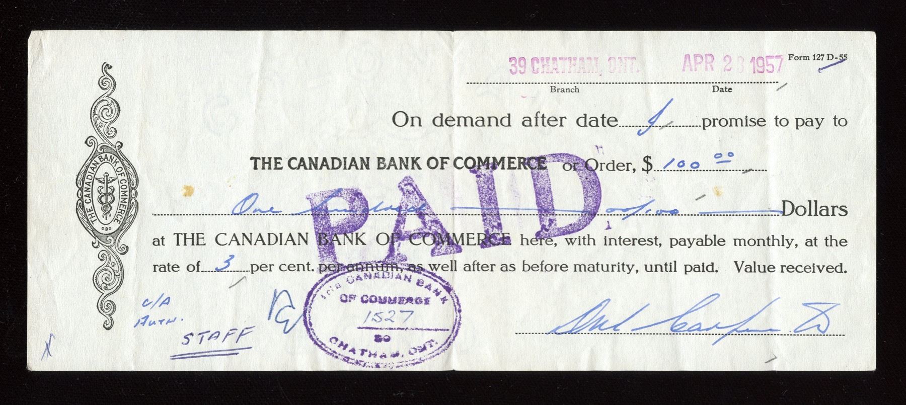 On demand note personally signed by D. M. Carpenter, CIBC for $100.00 dated Apri 23, 1957, On demand note personally signed by D.M Carpenter, CIBC for $2,000.00 dated Oct 3, 1974, On demand note personally signed by D.M. Carpter, CIBC for $5,000 dated May 14, 1975. CIBC Memorabilia - From the personal collection of Dennis M Carpenter, former Executive with the Canadian Imperial Bank of Commerce