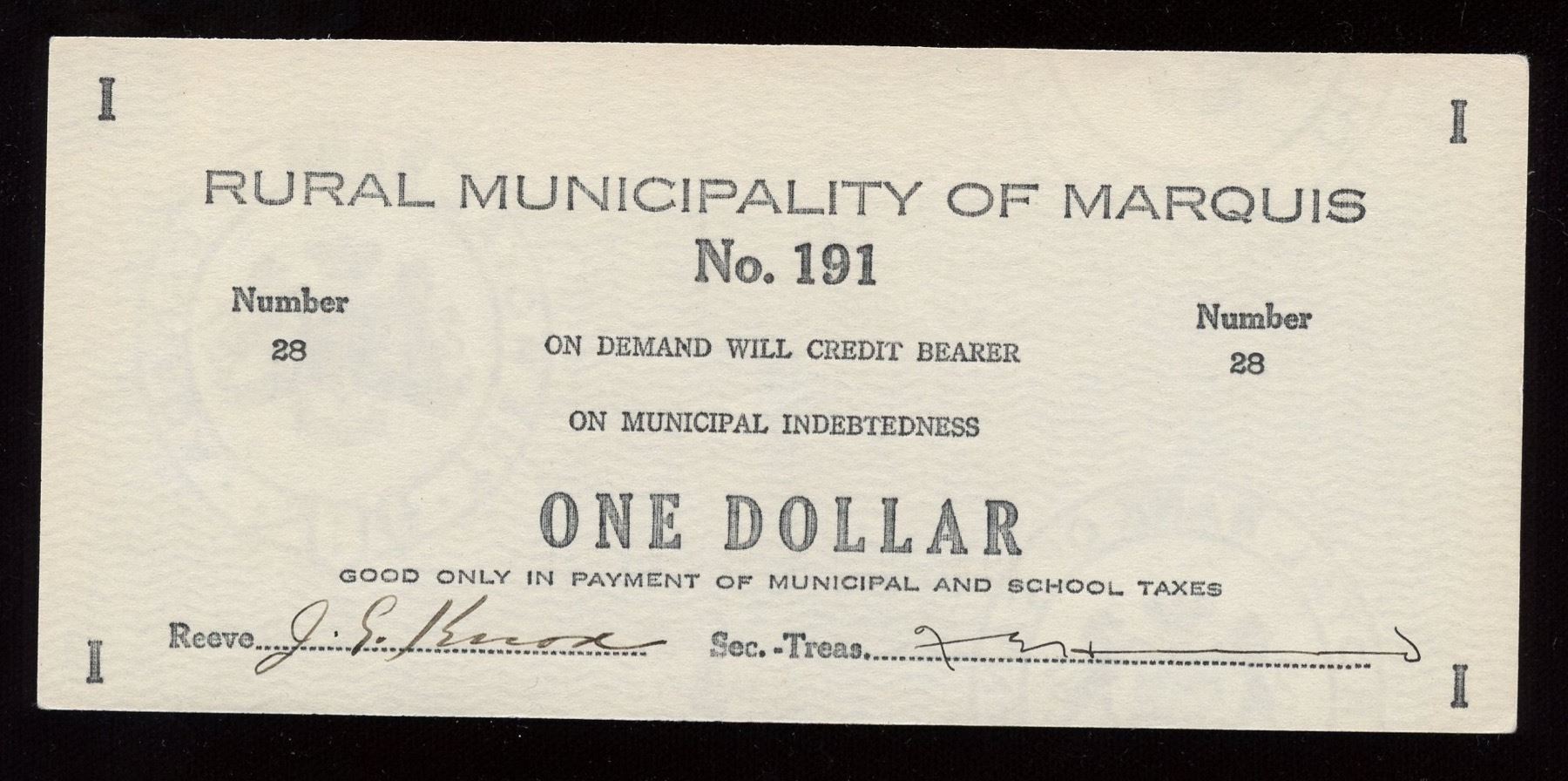 CH DE-100-1a, The Rural Municipality of Marquis, $1, Circa 1932. No. 191. These notes could be used in payment of taxes. Unc. Condition. S/N: 28