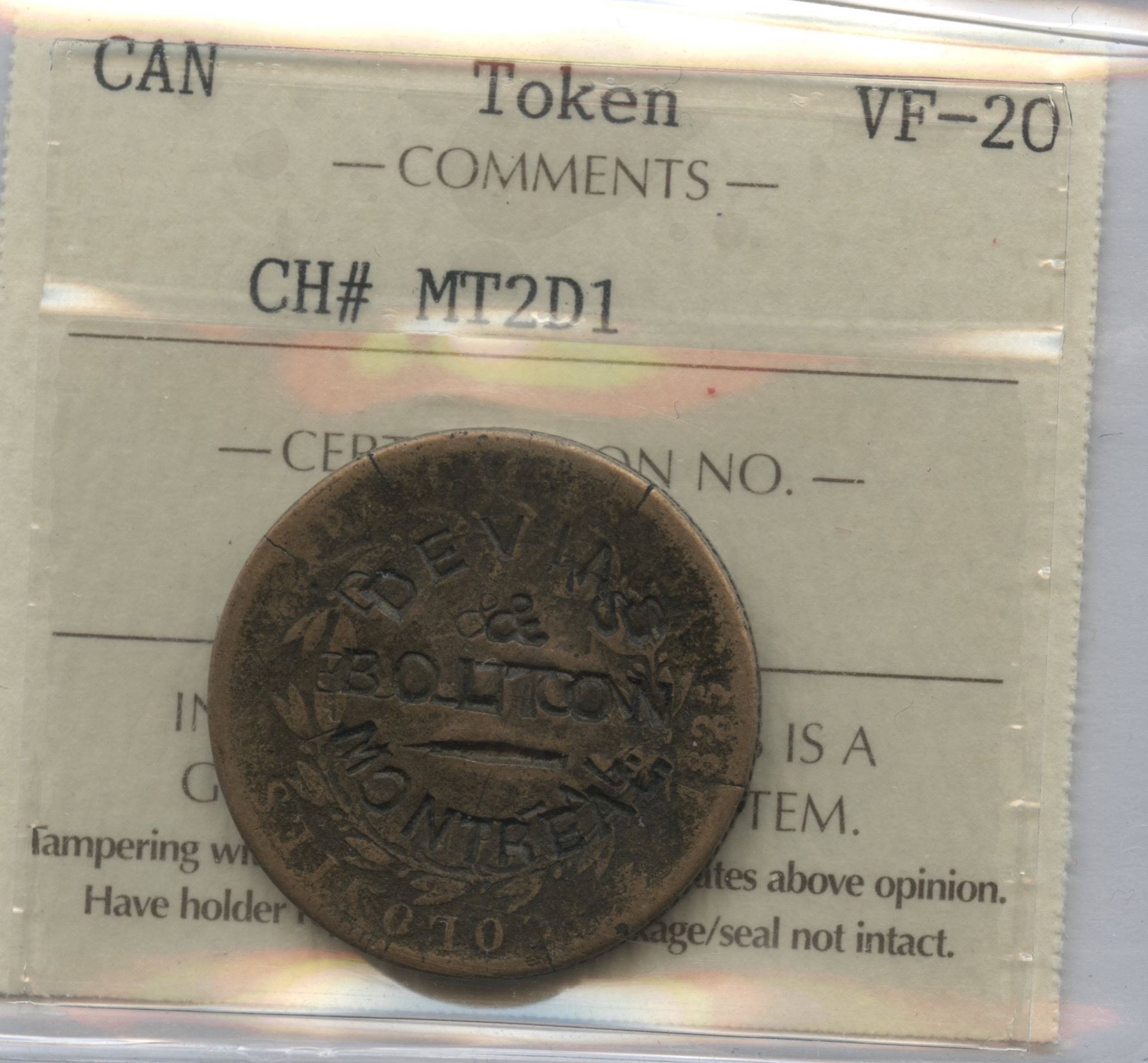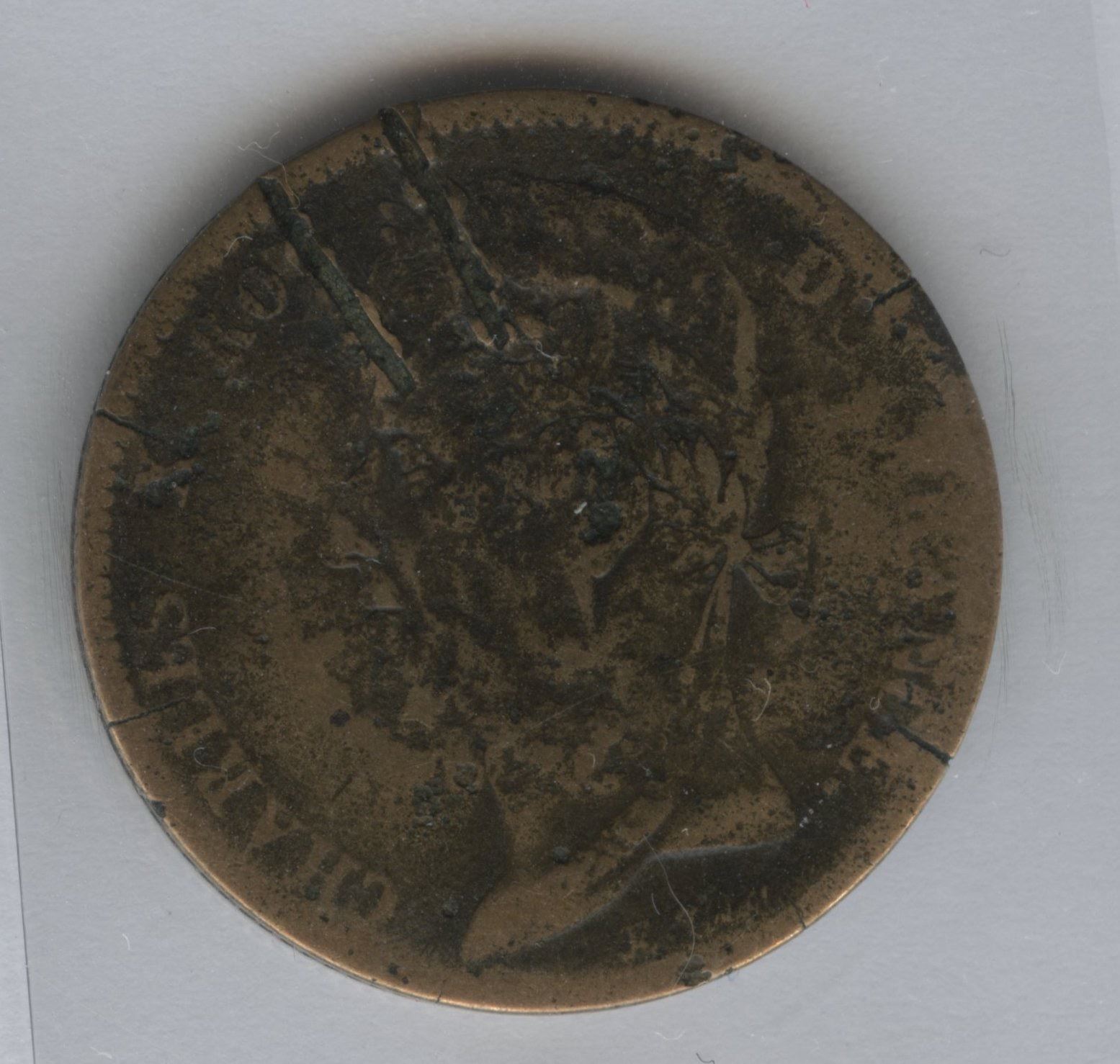 CH MT-2D1. ICCS VF-20. Counterstamped on a 1825 5 Centimes French Colonies coin. Charlton states extremely rare.