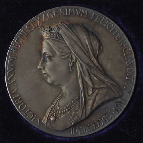 AR 56mm by G.W. de Saulles (after T.Brock & W.Wyon) Veiled head, crowned. Rev. Young head. Eimer 1817, BHM 3506, in case of issue, case a little dirty. Toned EF.