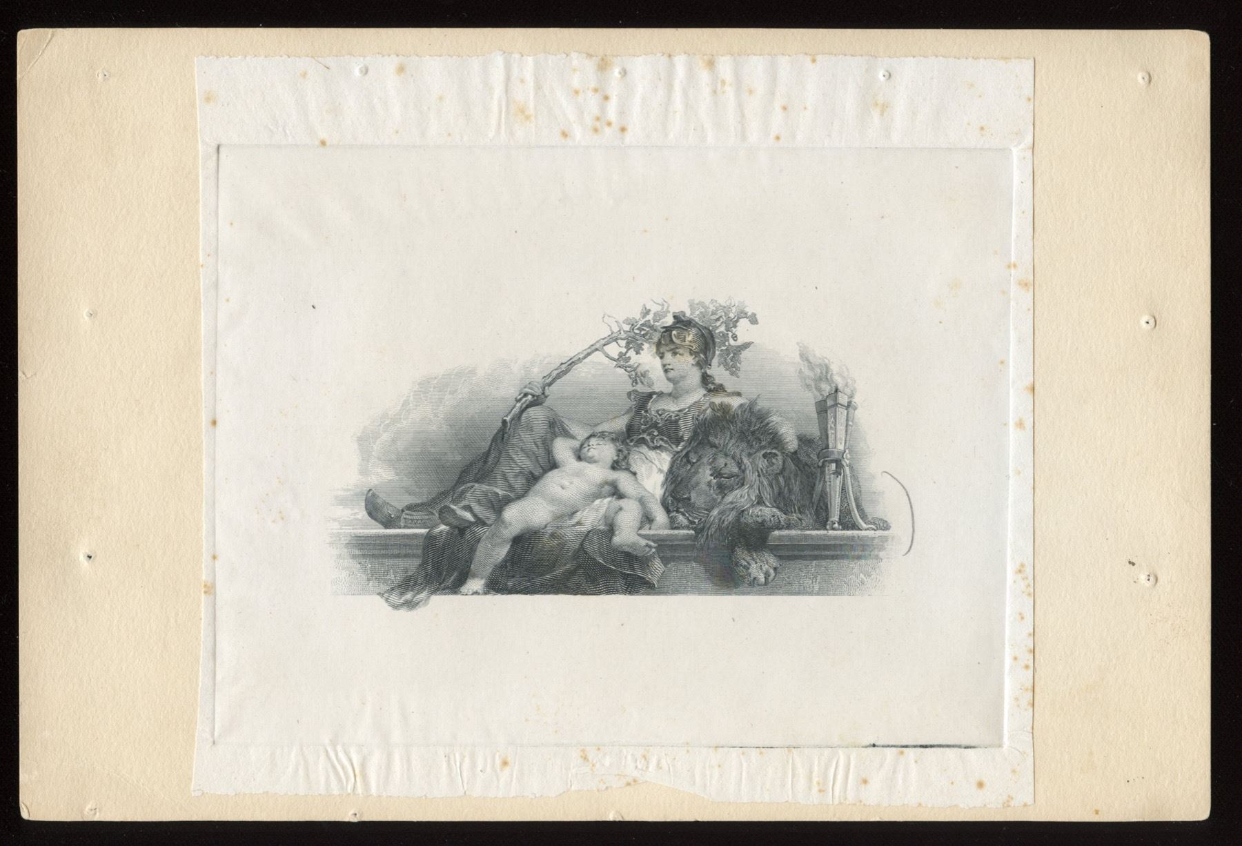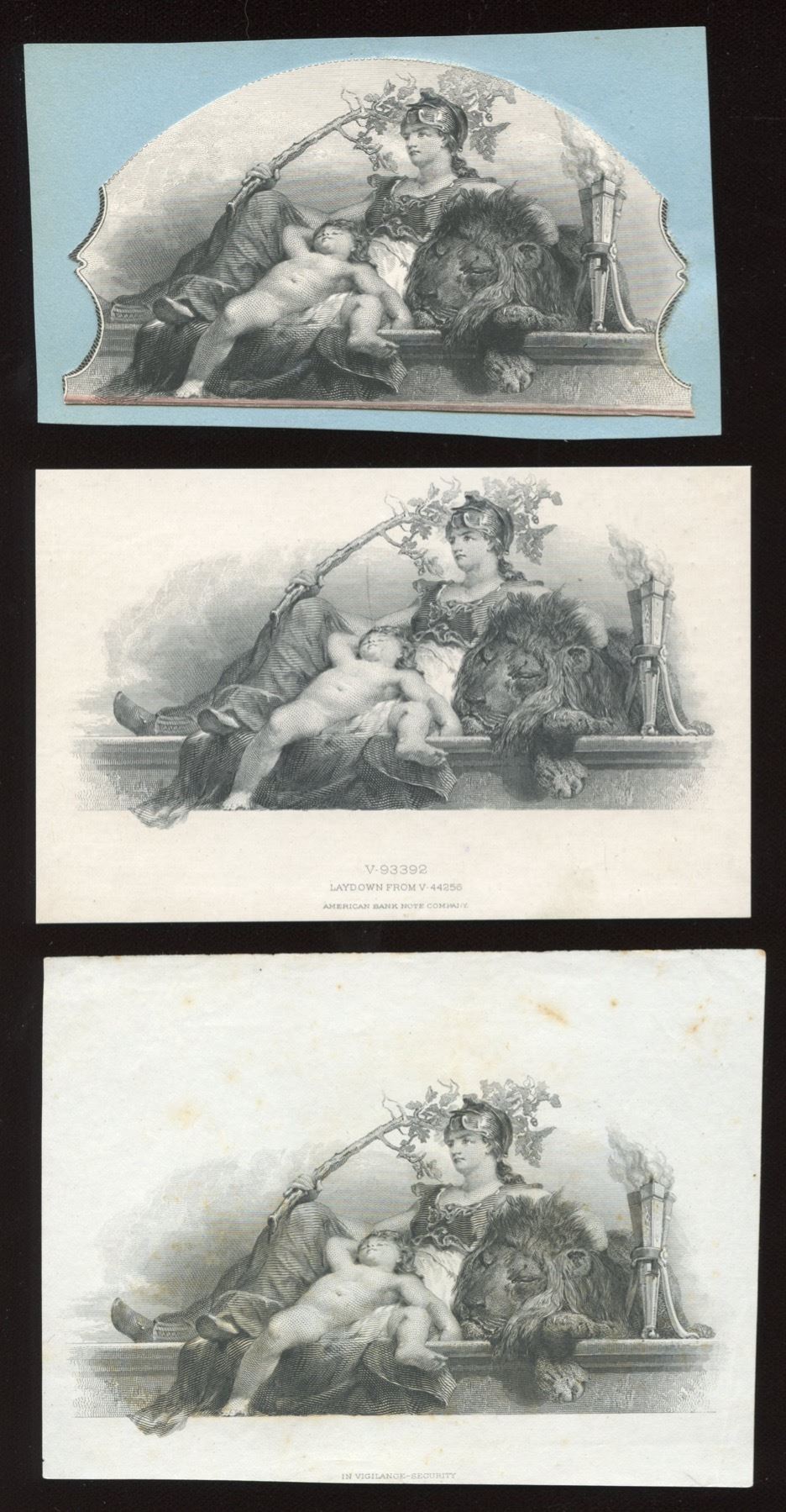 ABN V-44296/93392, in four settings: from unhardened die (no title, number or imprint), on card; with title, unmounted, cut down; without title but has numbers and imprint, on card; with frame added, trimmed to design, mounted on card. This vignette is quite similar to that on the Dominion Bank $10 1900 - 1925, but the book has been replaced with an infant.