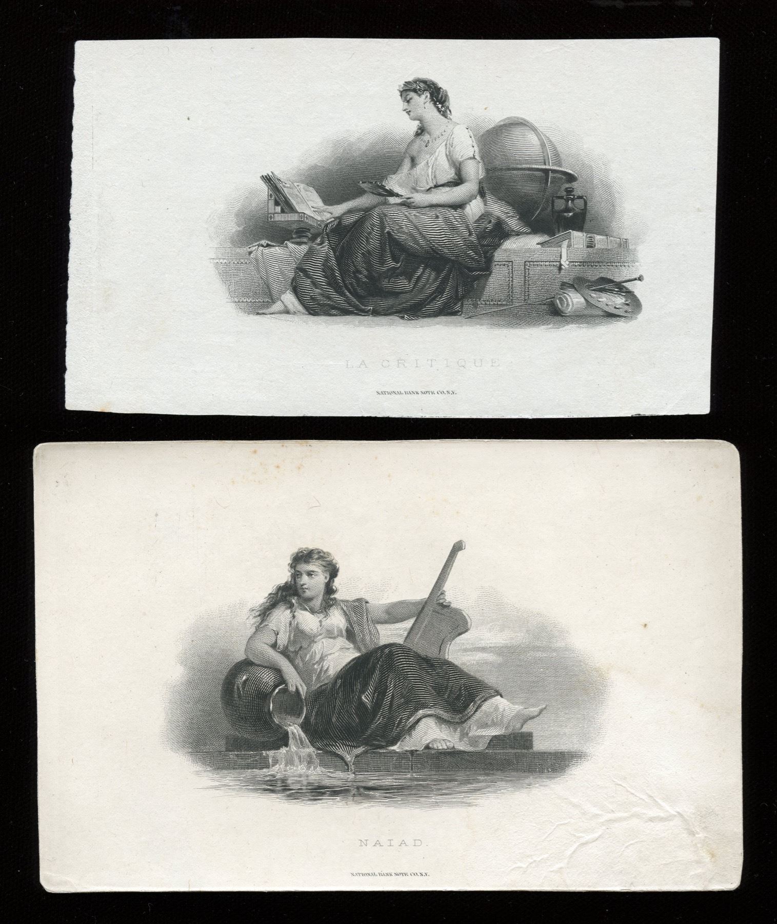 "Naiad", seen on 1893 to 1912 $50 notes, and "La Critique" seen on 1888 to 1912 $100 notes, both by National Bank Note Co. The first on card with some wrinkling, the second not mounted.