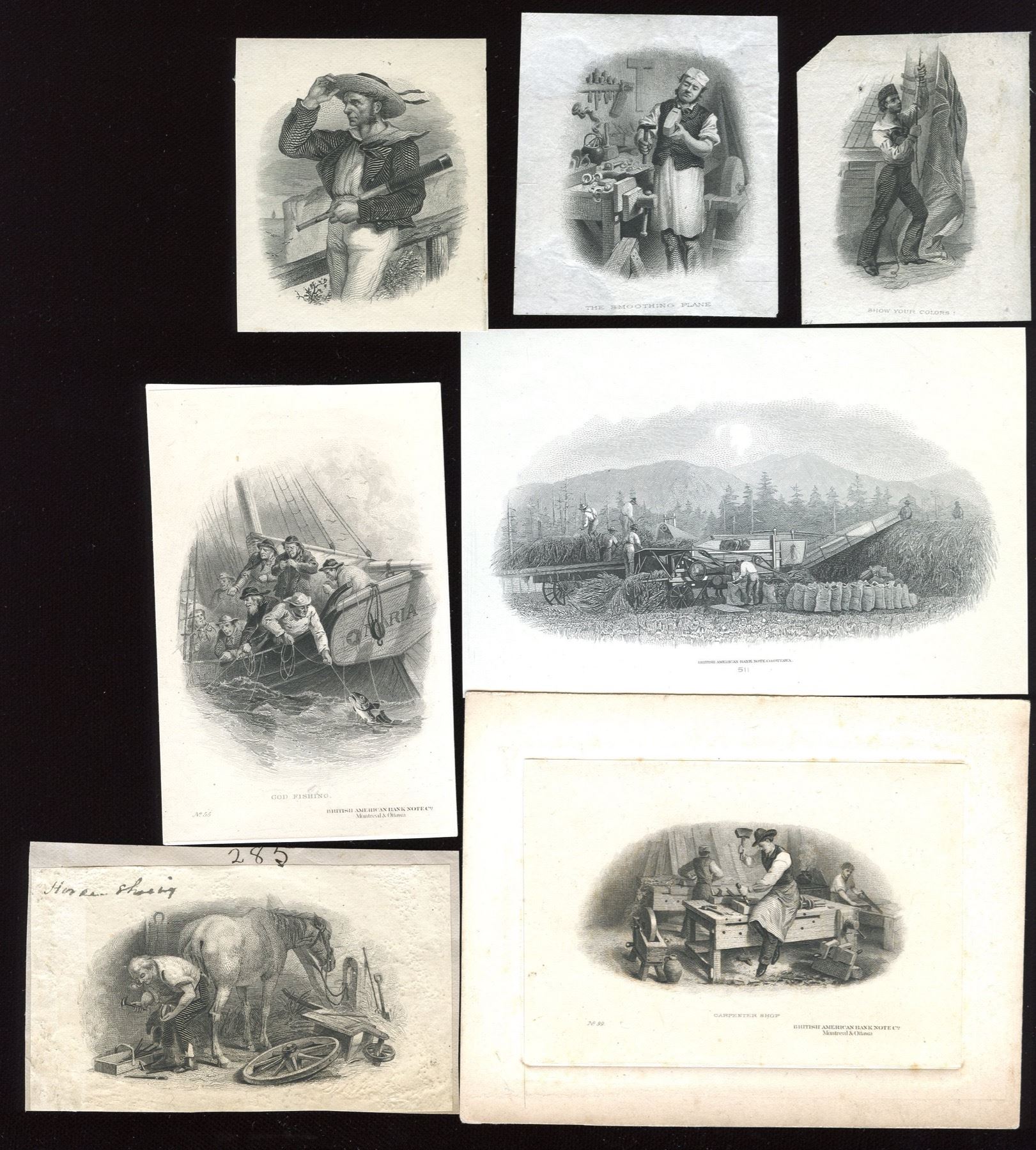 "Horse Shoeing" (BABN #285, engr. 1890); "The Smoothing Plane" (BABN #129, engr. 1874); "Carpenter Shop" (BABN #99, engr. 1872); "Cod Fishing" (BABN #55, engr. 1872 or earlier); "Show Your Colors (sic)" BABN #94, engr. 1872), two others. Seven vignettes.