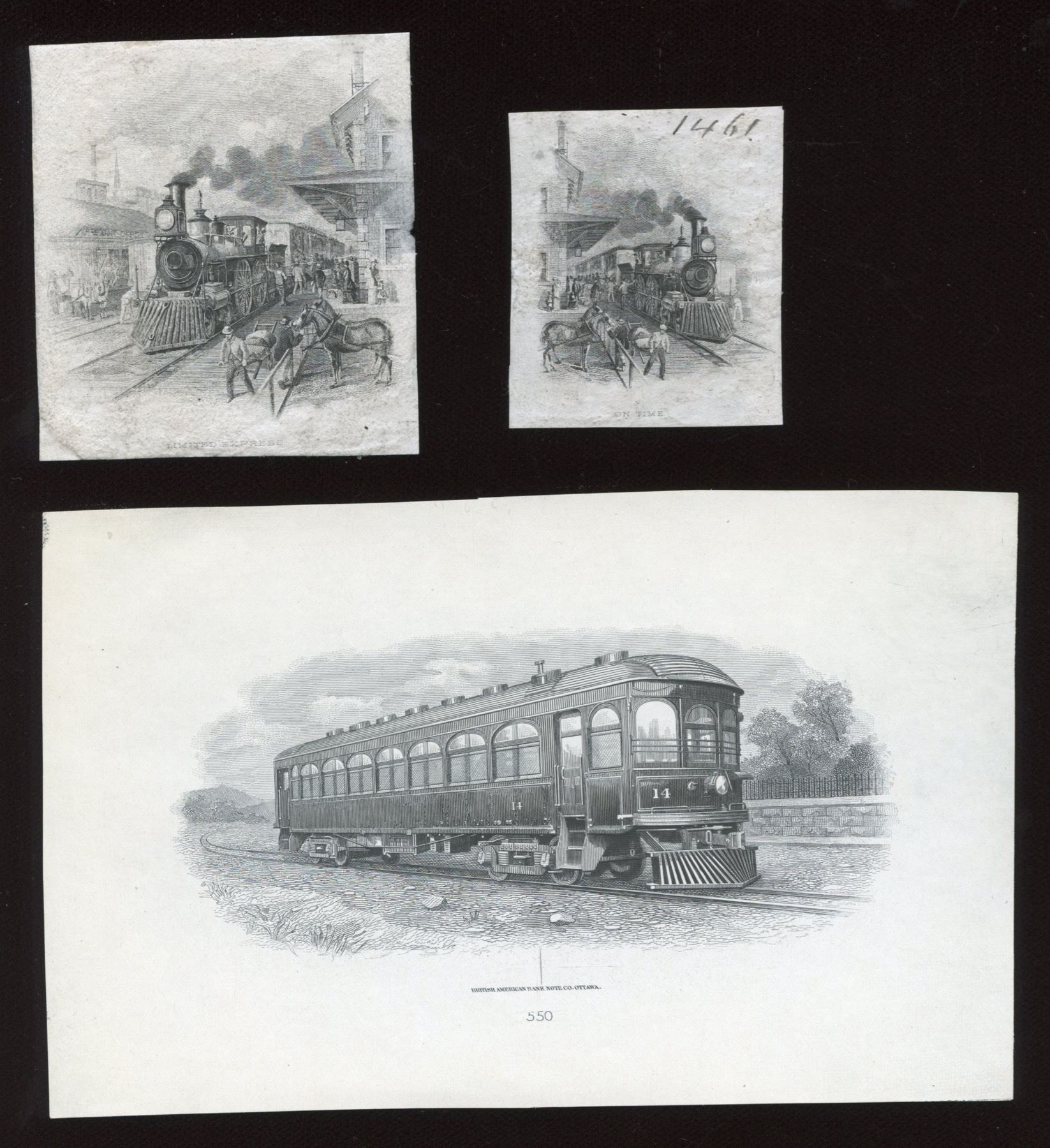 "On Time" train in station; "Limited Express"; streetcar, BABN #550. Three vignettes, not mounted, cut down, the latter on glossy paper.