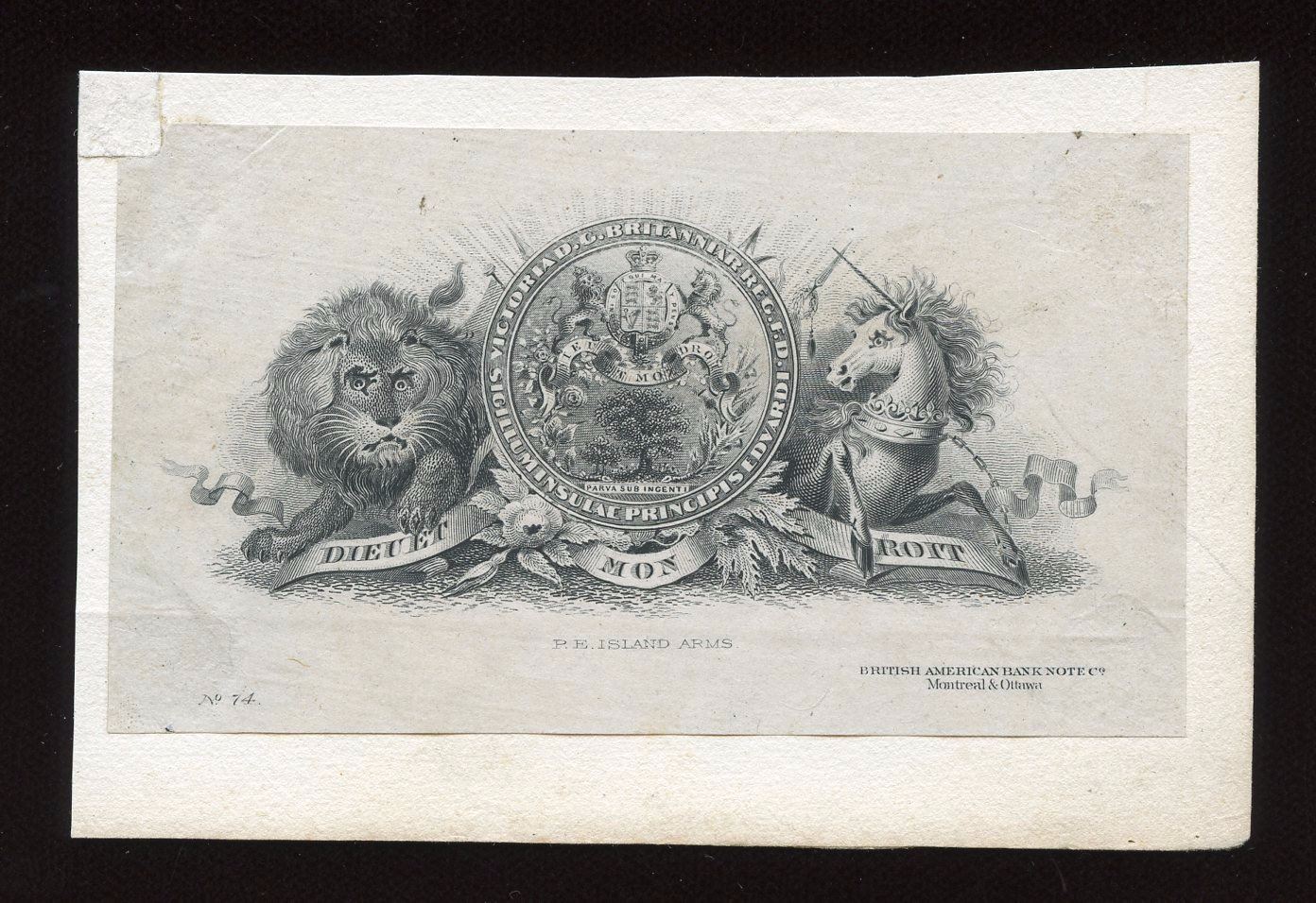 Die proof vignette: P. E. Island Arms, BABN#74. Vignette used on PEI 1872 $10 and $20 provincial treasury notes (PEI 18, 19), which are all but impossible to obtain. This rarely offered crest may help to fill a void.