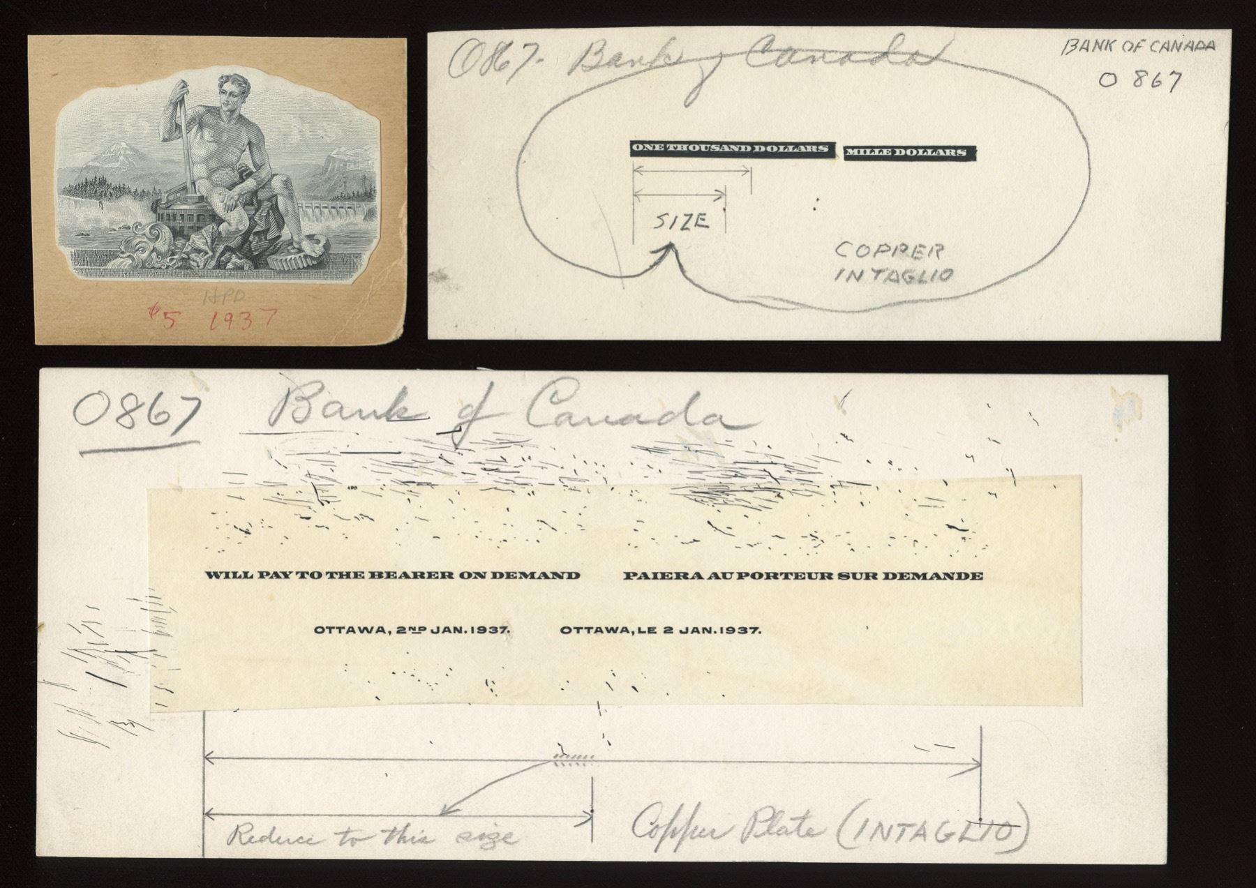 Die proof vignette, allegorical male on back of 1937 $5 (very slightly altered from 1935 $5, particularly at lower corners). Cut down and mounted, initialled HPD (Harry P. Dawson, the engraver) in pencil, very rare item. Lot also includes engraving of the Will Pay... and Date lines on the 1937 issue, part of order number O-867, with instructions to engrave on copper plate in a specified reduced size; denomination engravings for backs of $100, $500, $1000; two different engraved pieces in which Bank of Canada is curved, used on some early models for 1935 issue (see Walter Allan, Essays and Proofs for the 1935 Bank of Canada Issue, CPMS Journal, 1993 33-87), etc.